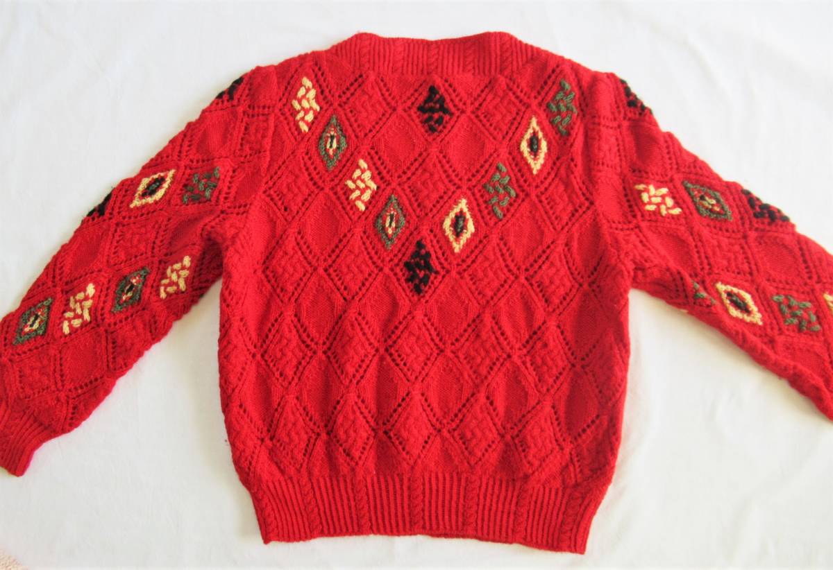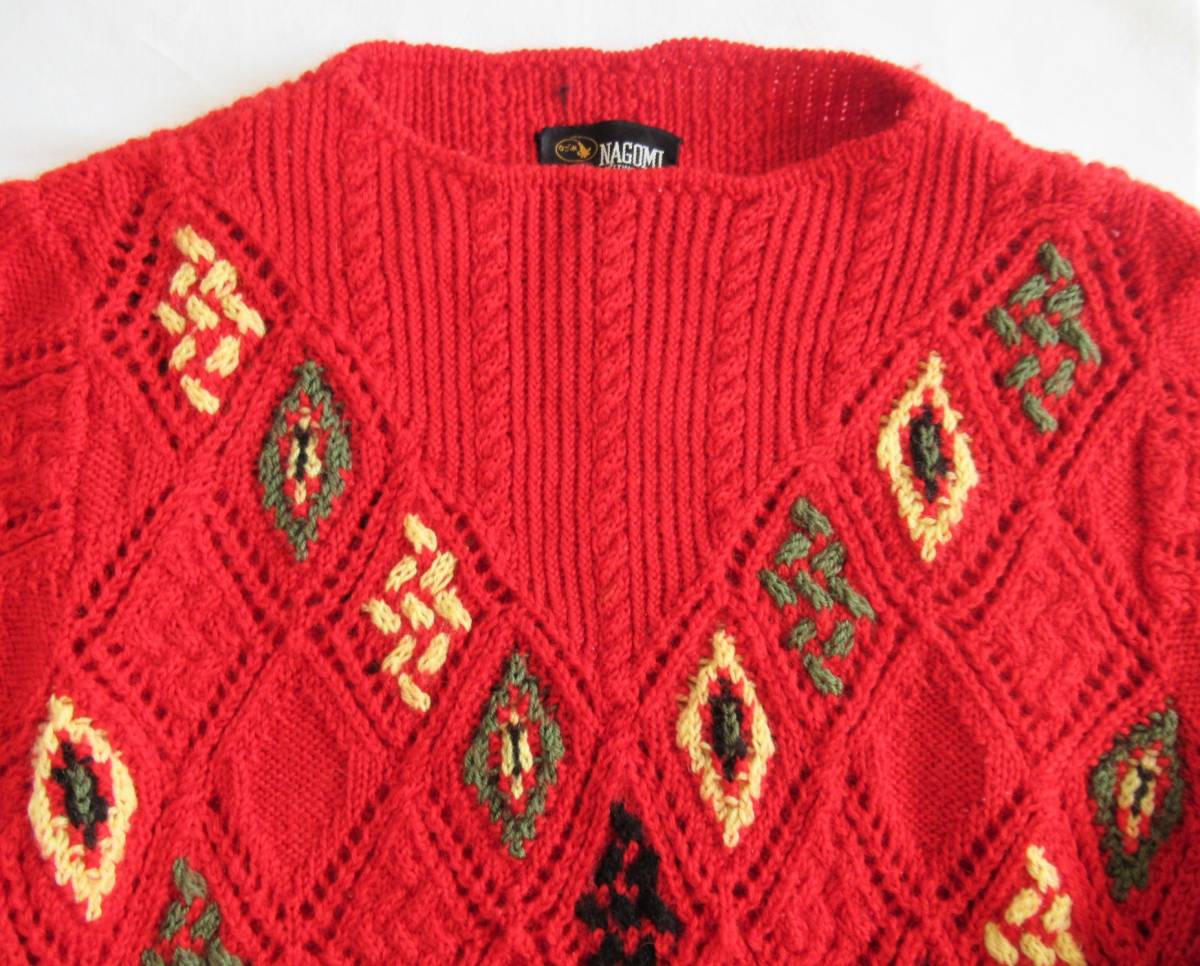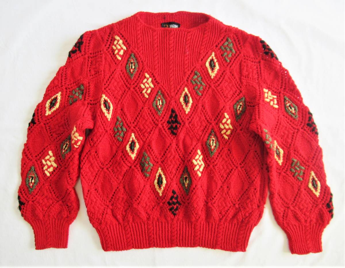 ハンドメイド【手編み】赤色系 透かし編み 柄入り 長袖 セーター ニットです。編み物好きの親戚からの委託品です。