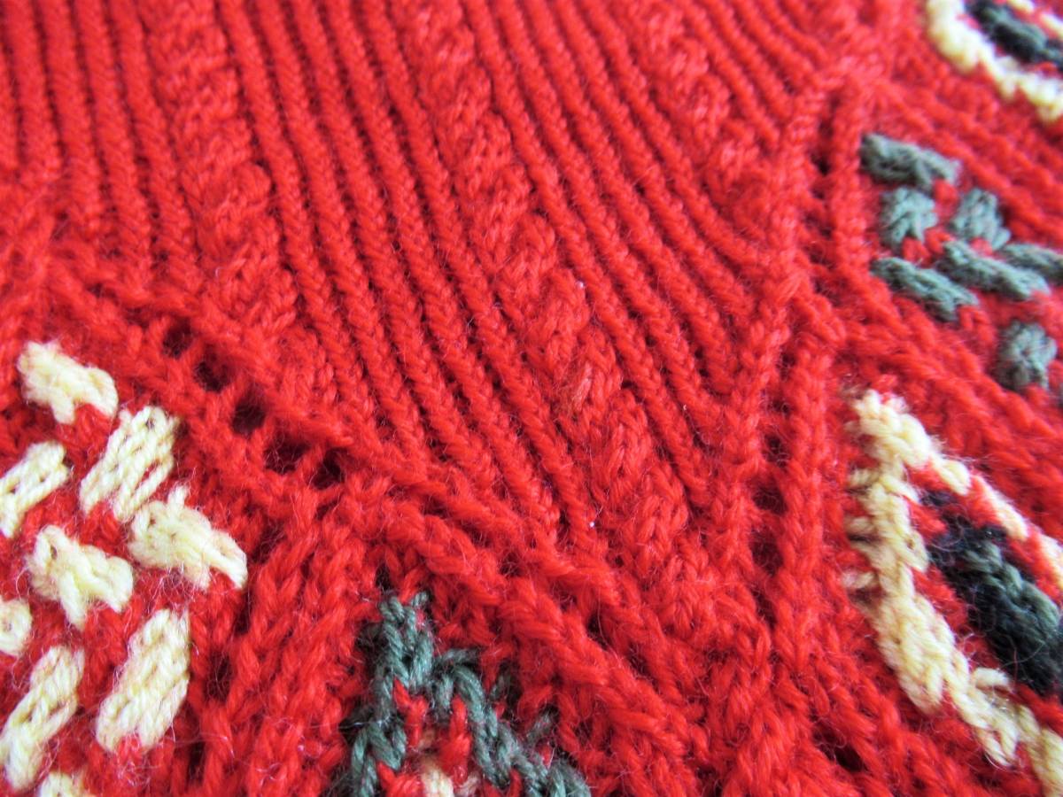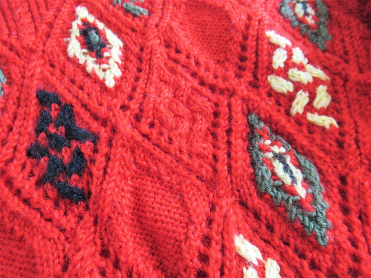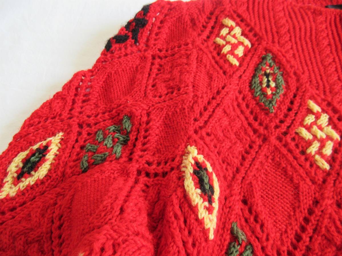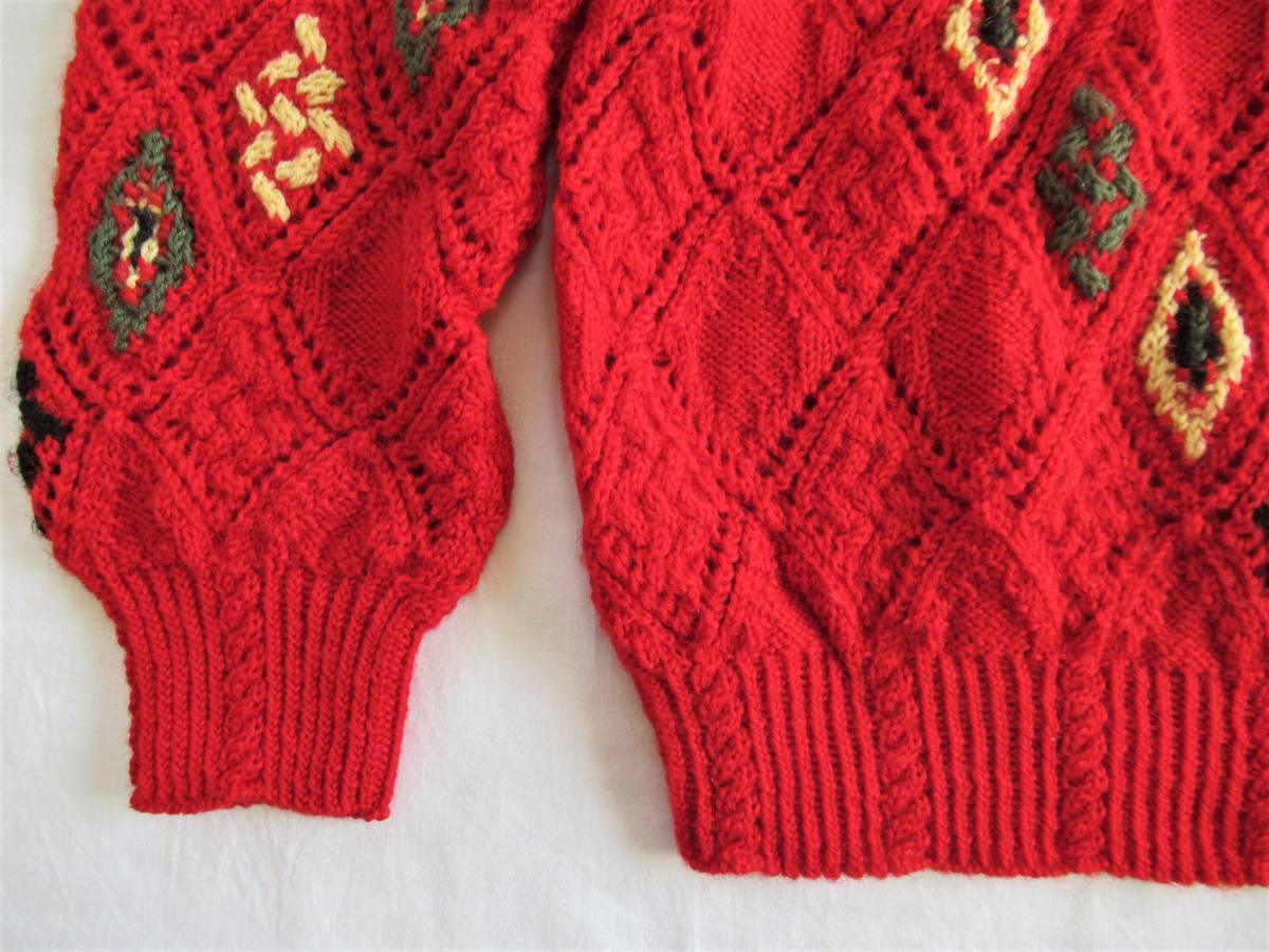 ハンドメイド【手編み】赤色系 透かし編み 柄入り 長袖 セーター ニット 毛糸