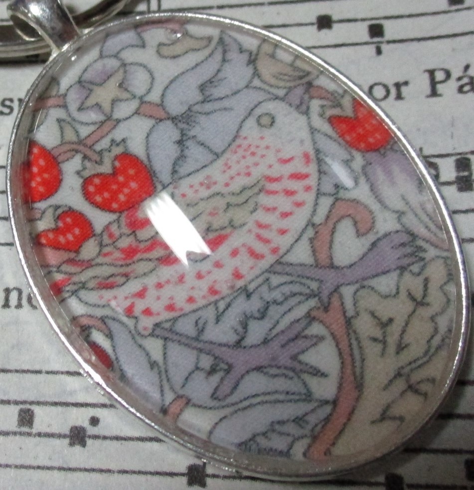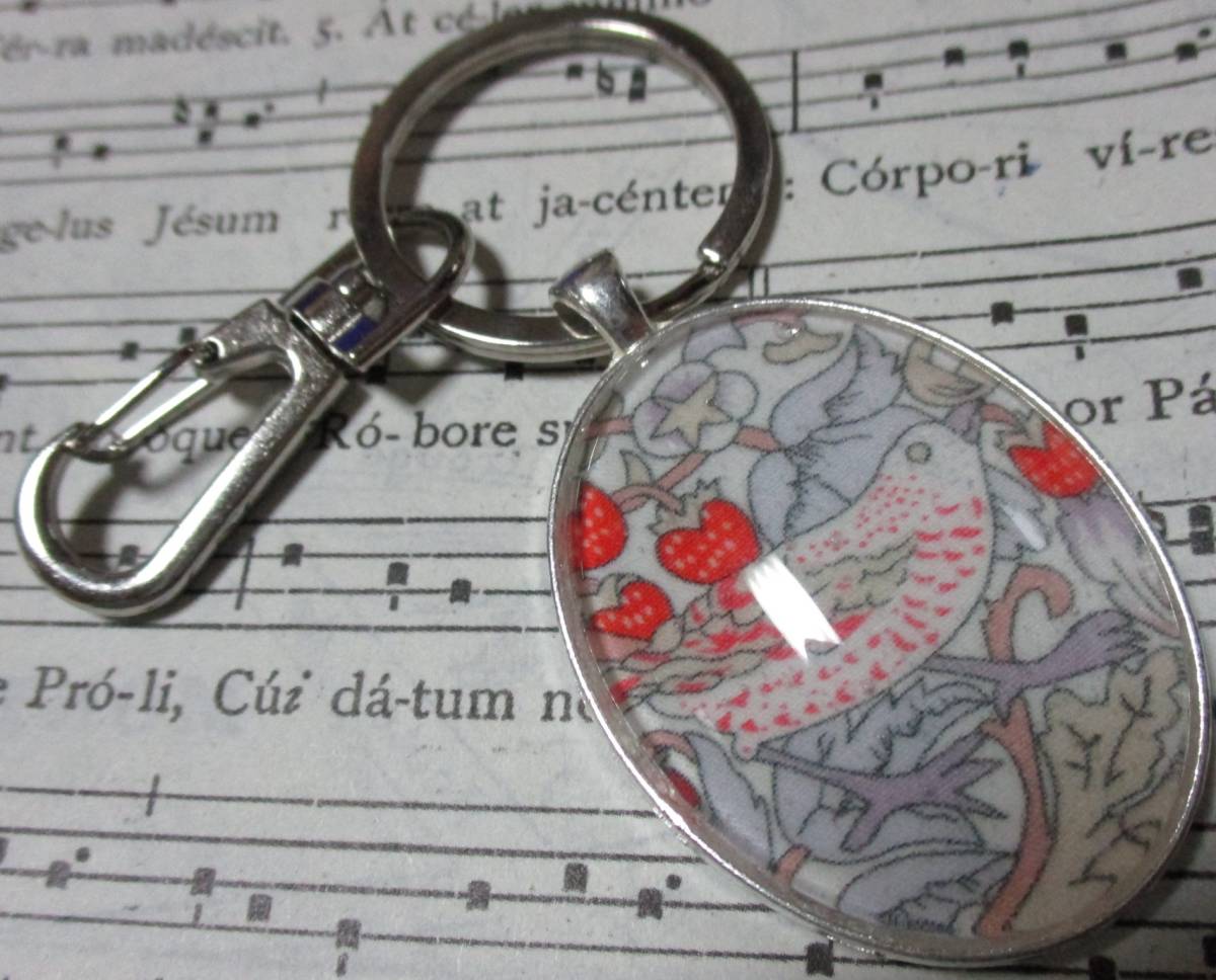 *リバティ Strawberry Thief ストロベリー シーフ  楕円 キーホルダー*キーリング いちご泥棒 ウィリアムモリス 鳥 シルバー