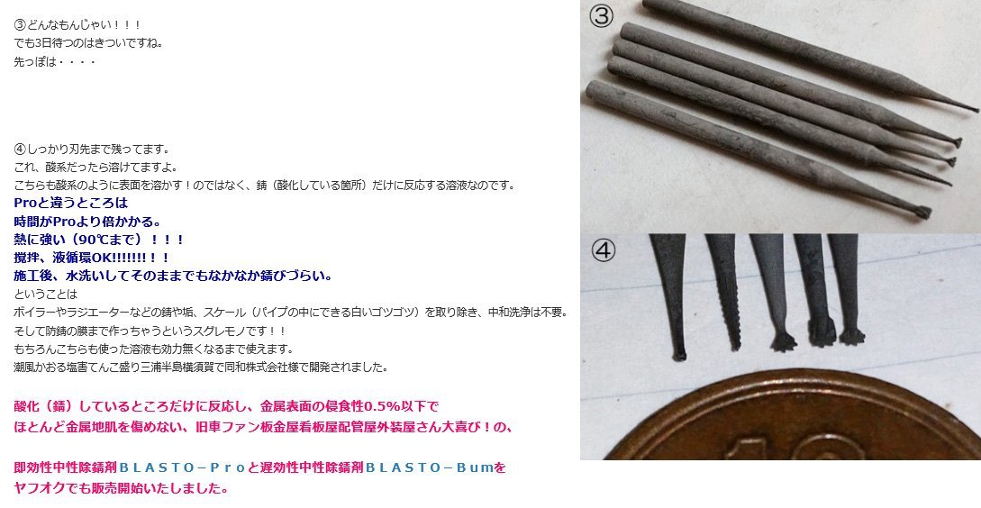 給水・給湯の配管、ボイラー、コンプレッサー内部のさび・水垢・スケールの除去や 鉄鋼製品・部品のさび取りに効果を 発揮します。