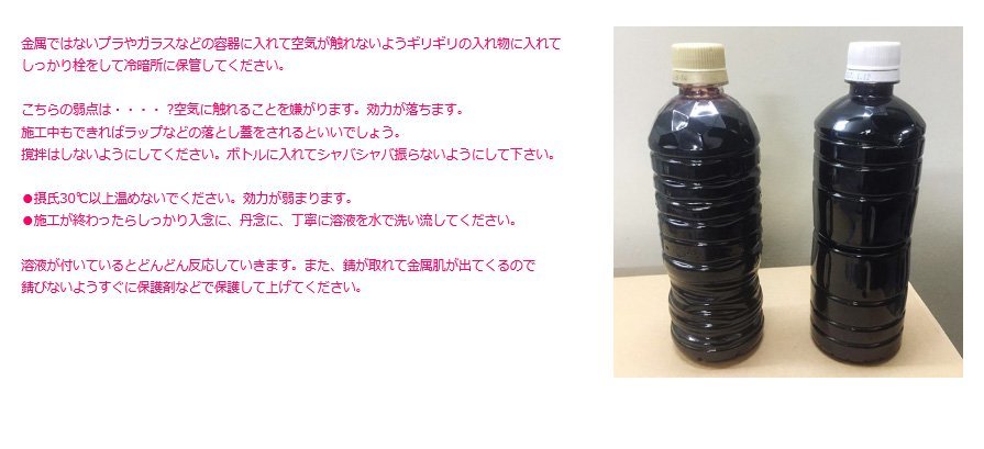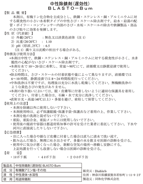 【製品概要】 本剤は、有機リン化合物を主成分とし、鉄鋼・ステンレス・銅・アルミニウムに対する 腐食性の小さい 水希釈タイプの中性さび・スケール除去剤です。