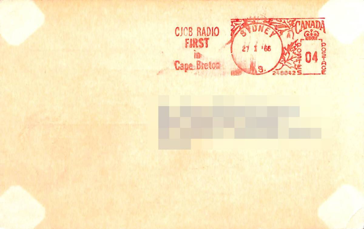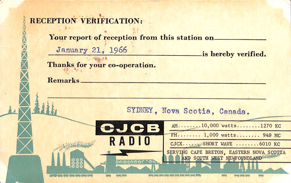 | 【商品名】・・・CJCBラジオのベリカード。 【コメント】・・・カナダのローカル局です。日本での受信は大変困難です! ■当方、1枚のみ所有していますので即決で落札者様のコレクションになります! 【国名・地名】・・・カナダ★ノバスコシア州・シドニー。 【受信データ】・・・1966年1月21日・SW6010KHZを受信。 【記載事項】・・・受信データ・受信者の住所・氏名が記載。 【状態】・・・シワ、汚れ、シミ、焼け、色あせ等があります。 ■カードの状態は★画像を参考に判断して下さい。 ■この機会にぜひこのベリカードを貴方のBCLコレクションに加えて下さい! | |