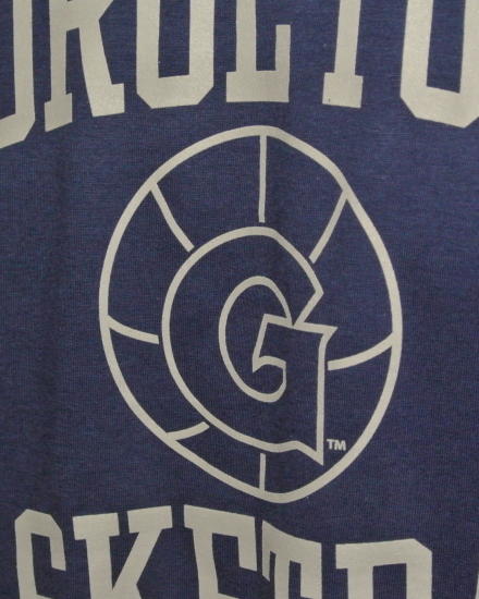 ネイビーの生地に、大学名、バスケットボールとGロゴ、BASKETBALLの文字が、赤みがかったグレーでプリントされております。
