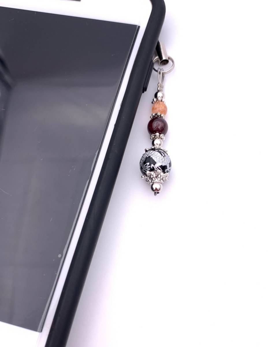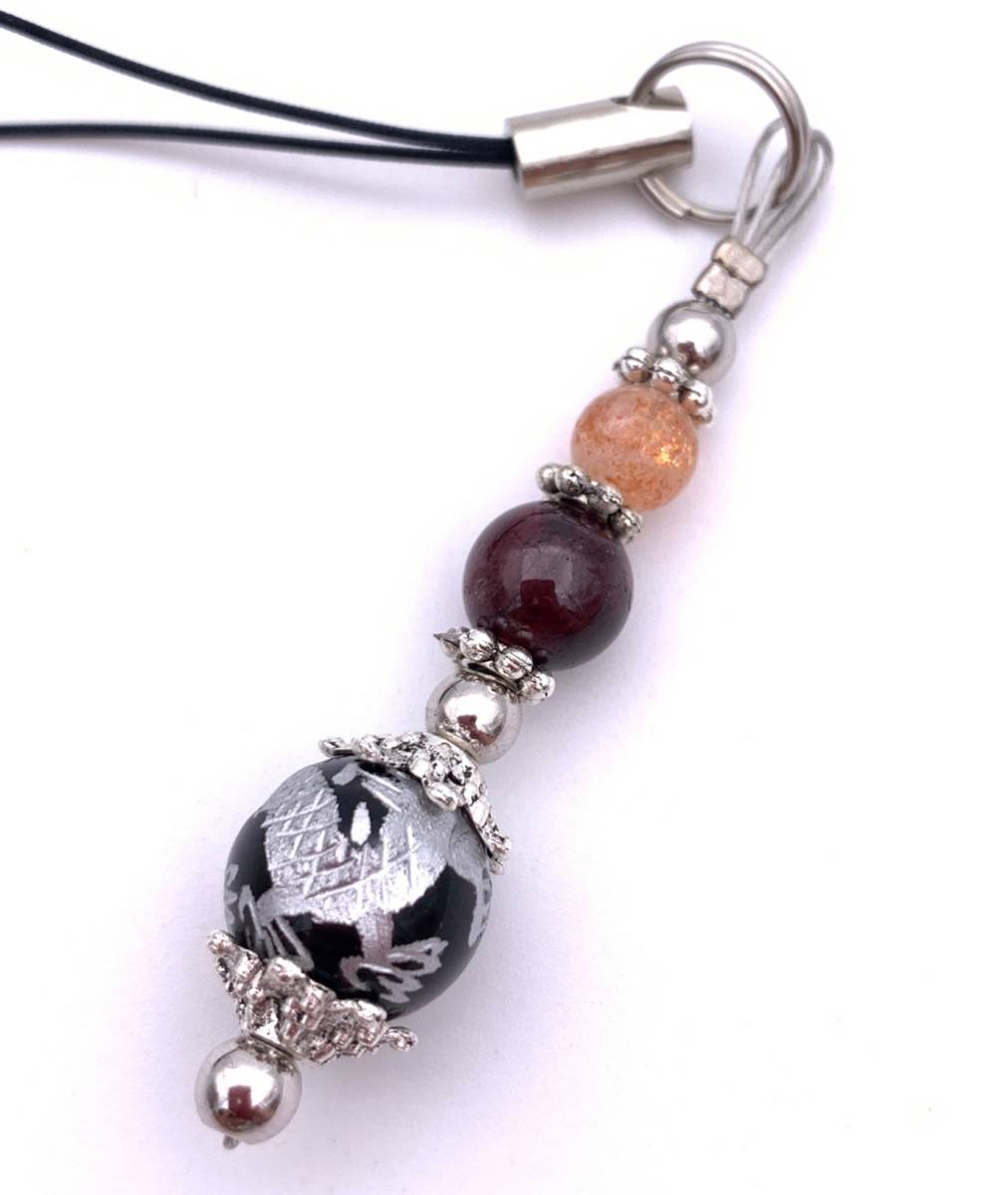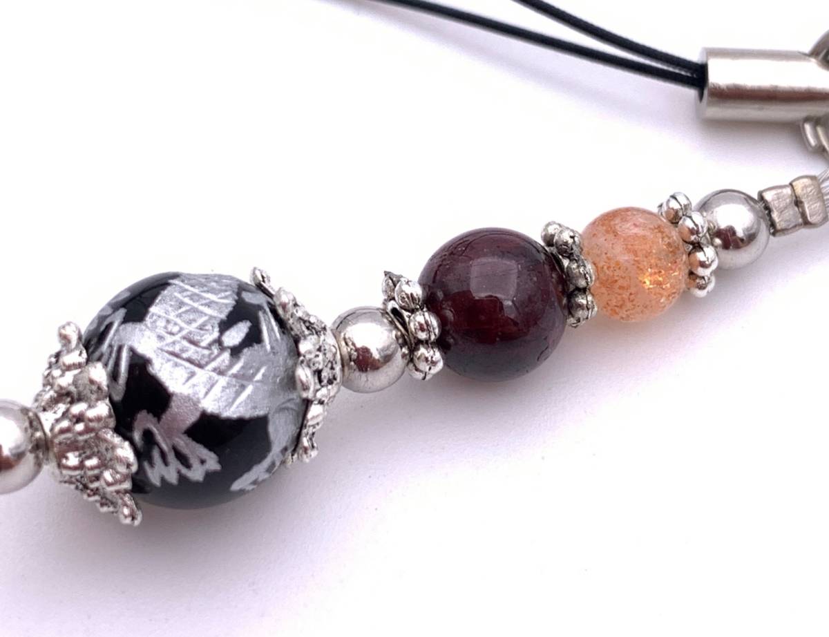 手作り!オリジナル★天然石オニキス銀彫り青龍&サンストーン&ガーネットのストラップ