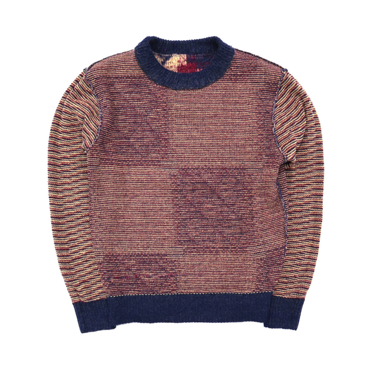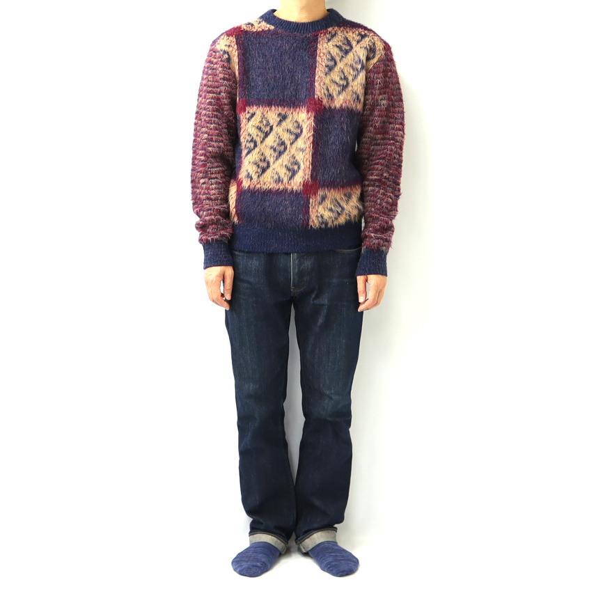 ケニントンのセーターです。70年代のアイテムです。品質表記のタグが無くなっておりますが、アクリルとモヘアの混紡になります。確かアクリル80%、モヘア20%の比率で、毛足の感じられるこの年代のモヘアらしい素材感です。サイズ表記は不明、日本サイズのM位です。画像では171㎝60キロが着用しており、ちょうどなサイズ感です。ヴィンテージのモヘアは人気も高く、年々見つけるのが難しくなっております。宜しくお願い致します。