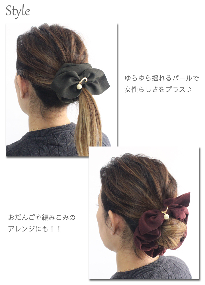 商品説明 | 秋冬のファッションにぴったりなカラー!! 今までのリボンヘアゴムより更に使いやすくアレンジの幅が広がりました。 ゆらゆら揺れるパールで女性らしさをプラス♪ ポニーテールはもちろん、おだんごや編みこみアレンジにも!! |