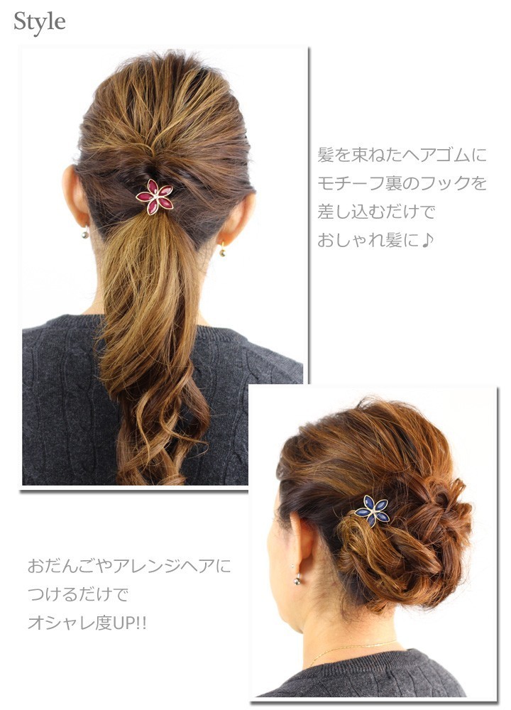 商品説明 | 使い方は髪を束ねたヘアゴムにモチーフ裏のフックをひっかけるだけ!! いままでのモチーフつきヘアゴムですとモチーフの位置や向きが思ったように決まらなかったり、 ゴムが伸びてしまって使えなくなってしまったりと。。。 そんな悩みをすべて解消してくれたのが『ポニーフック』新感覚アイテムです。 お団子やくるりんぱにつけたりと グッとおしゃれになりますので是非チャレンジしてみてください☆ また、単品使いはもちろんですが重ね付けすることでオリジナリティー感がでます!! |