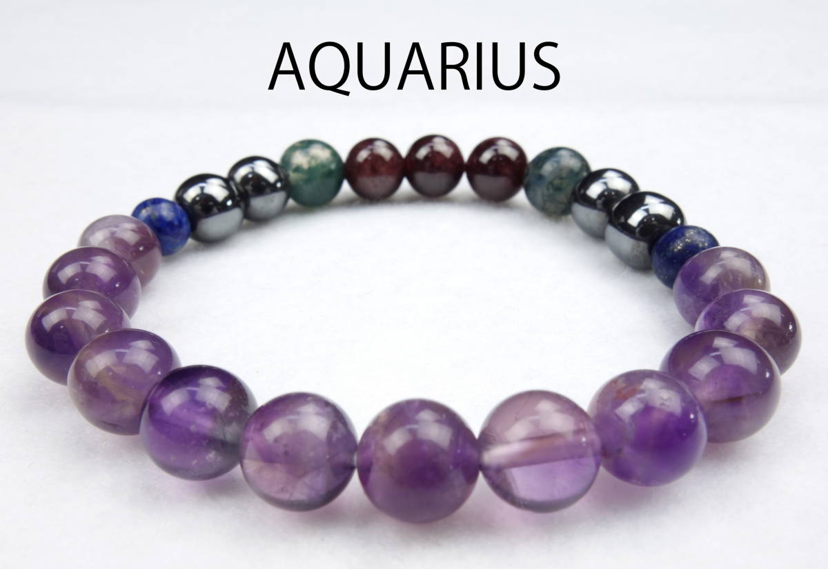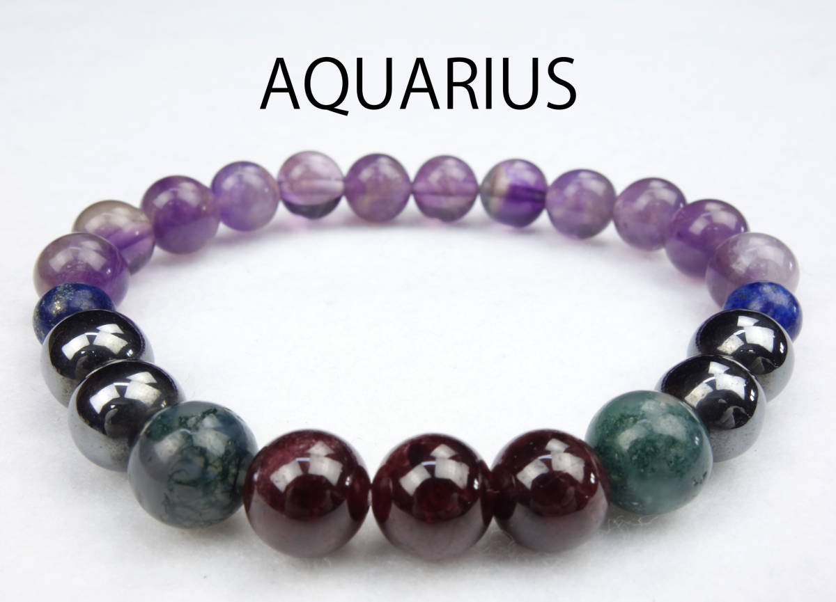 12星座をモチーフに作られた天然石のブレスレットです。 その星座に相性の良い天然石を何種類も贅沢に組み合わせたブレスレットです。 天然石ですので、まったく同じ柄の石は御座いませんので写真と多少違いがあるかと思います。 また天然石の為、大きさに多少の誤差があり、多少の凹みなども御座います。 これもまた天然石ならではの良さでもありますので、ご了承頂ければと思います。 水瓶座:AQUARIUS エレメント:AIR 守護星:天王星 相性の良い星座:双子座・天秤座 天然石の種類(ブレスレットの構成):アメジスト・ラピスラズリ・苔瑪瑙・ヘマタイト・ガーネット 石の大きさ:約8mm 石の個数:22個~27個(ブレスレットの大きさにより異なります) ブレスレットの長さ:約17cm *収納箱を1個付属させて頂きます。 | |||