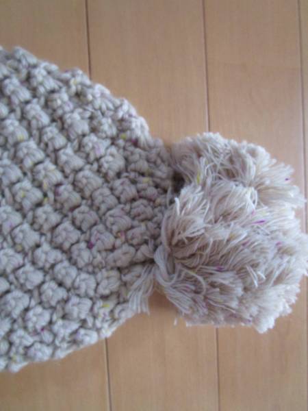 ぽこぽこした編み地と大きめのボンボンがかわいいです。