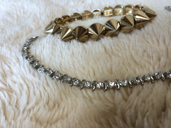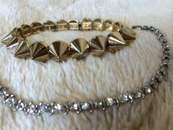 とても素敵なゴールドタイプの円錐型フリーサイズの未使用のブレスレットと、クリスタルガラス使用の長さ約20cmのシルバーカラーの美品のブレスレットです!