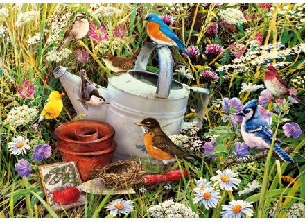 (500-641406) 500ピース 木製ジグソーパズル 鳥と園芸用品 夏 生命力あふれる庭 コマドリ、ルリツグミ、アオカケス、アメリカキンカチョウ