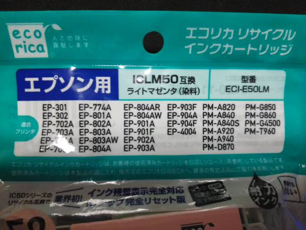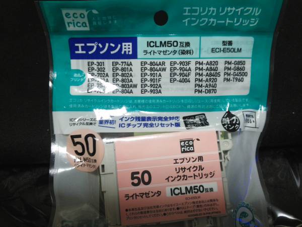 エプソンインクカートリッジリサイクルインクカートリッジのライトマゼンタ新品未開封品です。ICLM50互換の1個です。適合は画像に載っている物になります。ノークレームノーリターンでお願い致します。型番ECI-E50LMエプソン用
