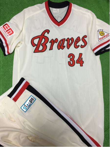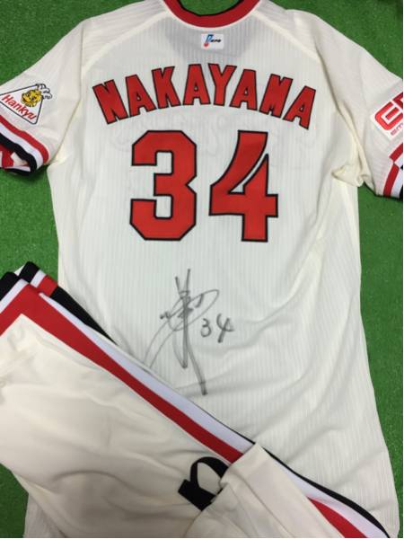 ORIXの中山投手が’12シーズン公式戦の阪急復刻試合で実使用した直筆サイン入りユニフォーム上下です。