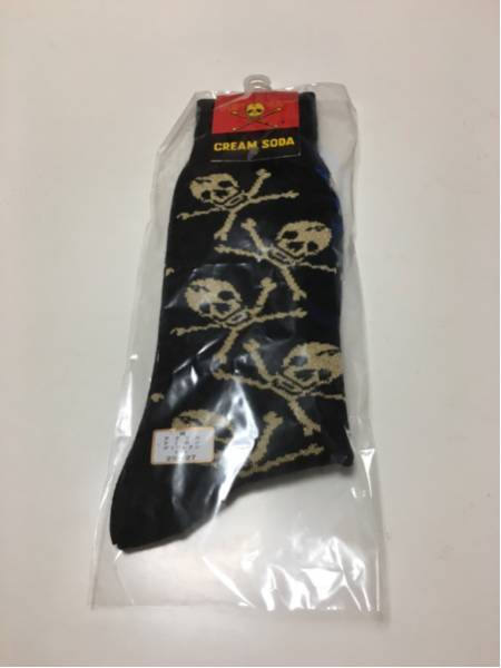 約20年前に購入したクリームソーダのソックスです。新品未使用で安心して使用できます。黒ベースでドクロは金ラメのビンテージ ソックスです。