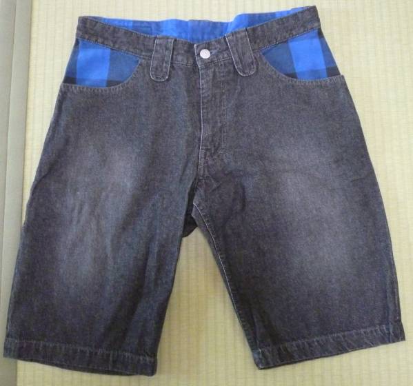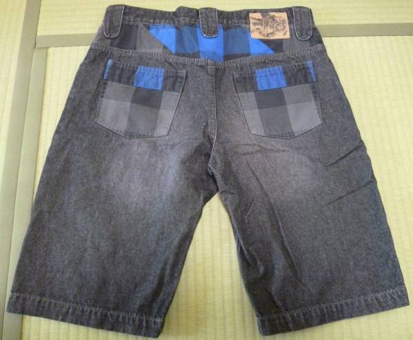 大変手の込んだショーツになり、黒のデニム地をベースに至るところにグレーとブルーのバッファローチェックの切り返しが施され、革パッチはヘビと鷹がデザインされております。ベルトループも特徴的な形をしており、細かいところにまでこだわったショーツになります。
