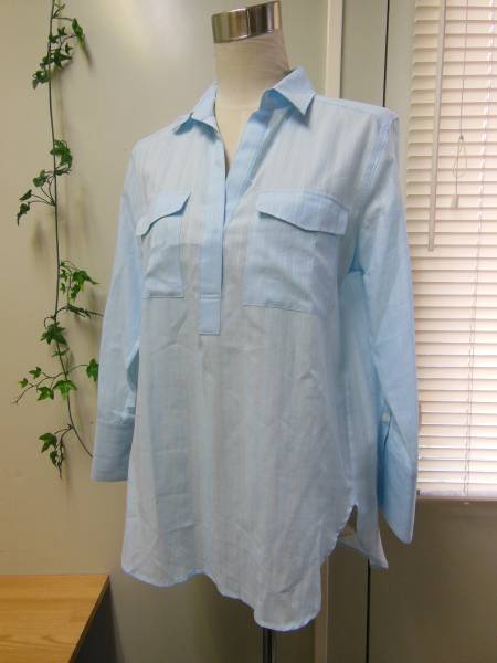 清涼感のあるライトブルーにストライプが入った、肌ざわりの良いさらっと着られる1枚です(*^_^*)