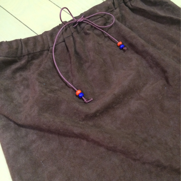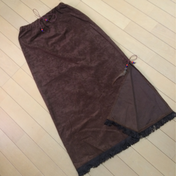 ◆少し赤みあるこげ茶でウエスト&スリット部に合皮リボンとカラービーズ♪スリット部のリボンには羽根付♪裾フリンジ風♪薄手ベロアかスエードっぽい秋冬の質感です