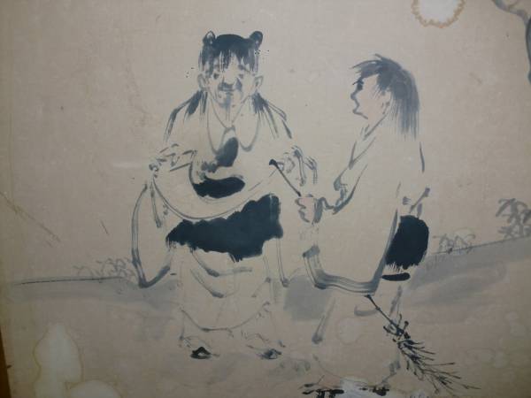 【模写】 中国画 非常に古ーい寒山拾得尊像圖 X錦作 唐木枠