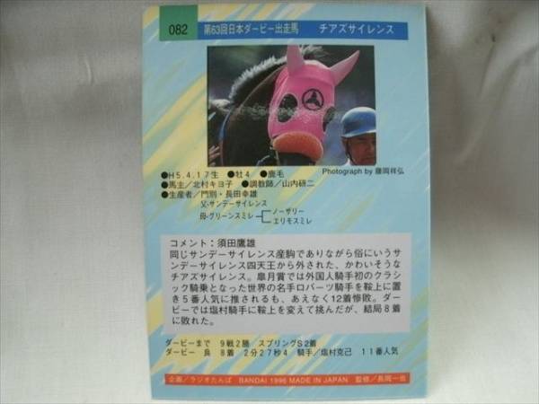 | ☆☆☆商品説明☆☆☆ 【メーカー】 バンダイ 【シリーズ】 96年上半期サラブレッドカード 【番号】 082 チアズサイレンス 【レース】 第63回日本ダービー出走馬 【数量】 1枚 サラブレッドカードの第2弾96年上半期カードになります。 |