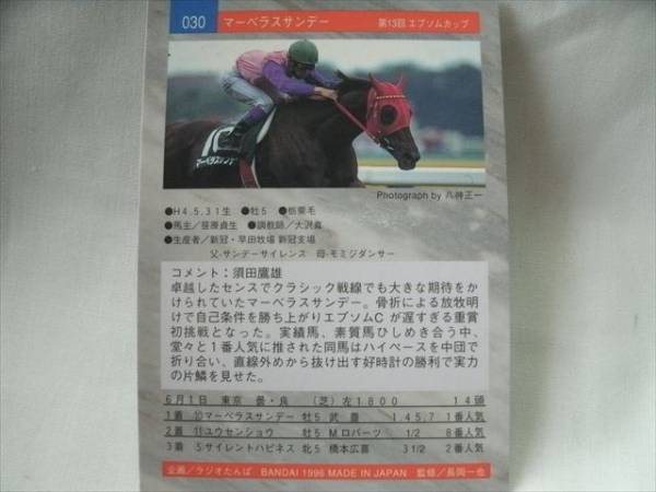| ☆☆☆商品説明☆☆☆ 【メーカー】 バンダイ 【シリーズ】 96年上半期サラブレッドカード 【番号】 030 マーベラスサンデー 【数量】 1枚 サラブレッドカードの第2弾96年上半期カードになります。 |