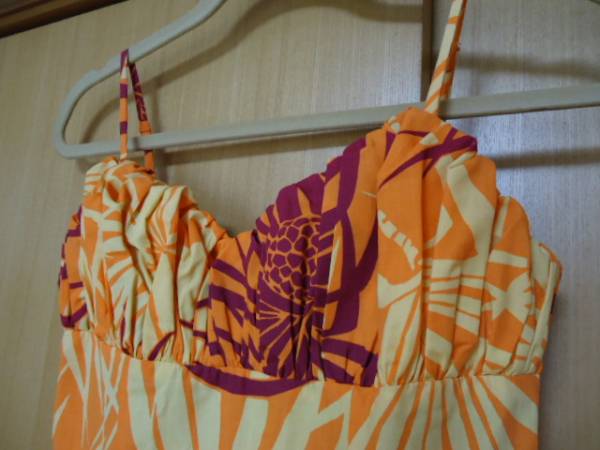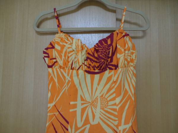 ハワイにて、古着として、購入しました。Rainbow Hawaii社製。コットン35%・ポリエステル65%混合素材。カラーは、オレンジ色地に、木の実・葉っぱ柄です。クリーニング済み。ハワイ製。後ろファスナーあります。サイズ表示は、Sとありますが、だいたいXSぐらいですが、平置き実寸を重視して下さい。なお、当商品のサイズ表示は、全てUSAサイズです。なお、少々誤差は、ご了承下さい。肩ヒモ幅約27センチ・身幅(脇の下)約36センチ・丈約129センチです。目立ったダメージありませんが、USED物なので、古着にご理解のある方のみ入札をお願い致します。24時間以内に、お手続き入力後、期限内にかんたん決済、出来る方のみ、ご入札をお願い致します。この商品は、1点物です。 ※※発送方法・送料は、レターパックライト郵便(追跡可能・補償無し)ですと、430円又は、レターパックプラス郵便(追跡可能・手渡し配達・補償無し)ですと、600円又は、ゆうパック送料着払い便(持ち込み割引有り・追跡可能・手渡し配達・補償有り・かんたん決済時は、送料0円ですが、送料のみ到着時支払い)です。※※ ☆★★★★★☆送料は、変わりますが、何点でも、同梱包可能です。数点落札されましたら、まとめて取引を、選択お願いします。☆★★★★★☆