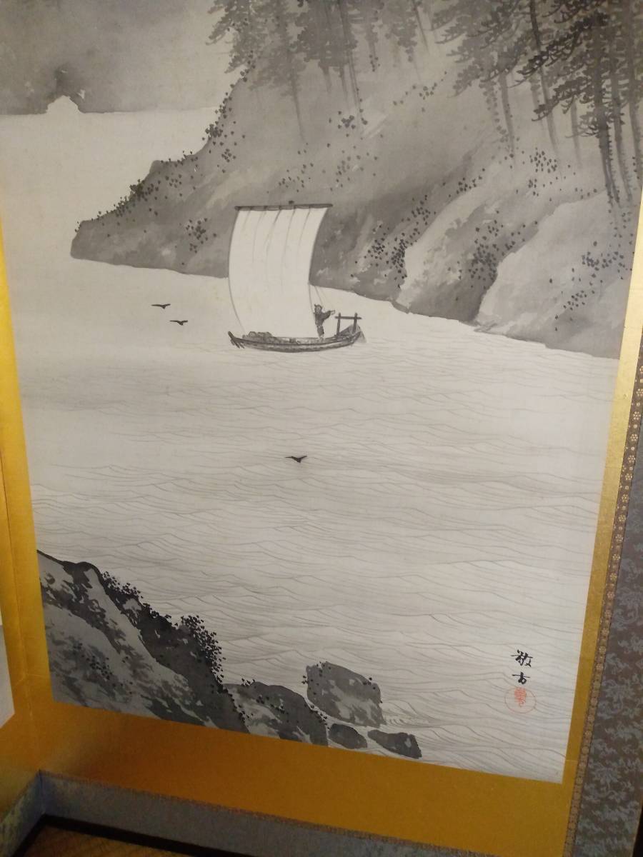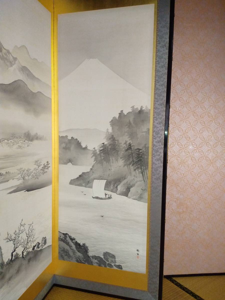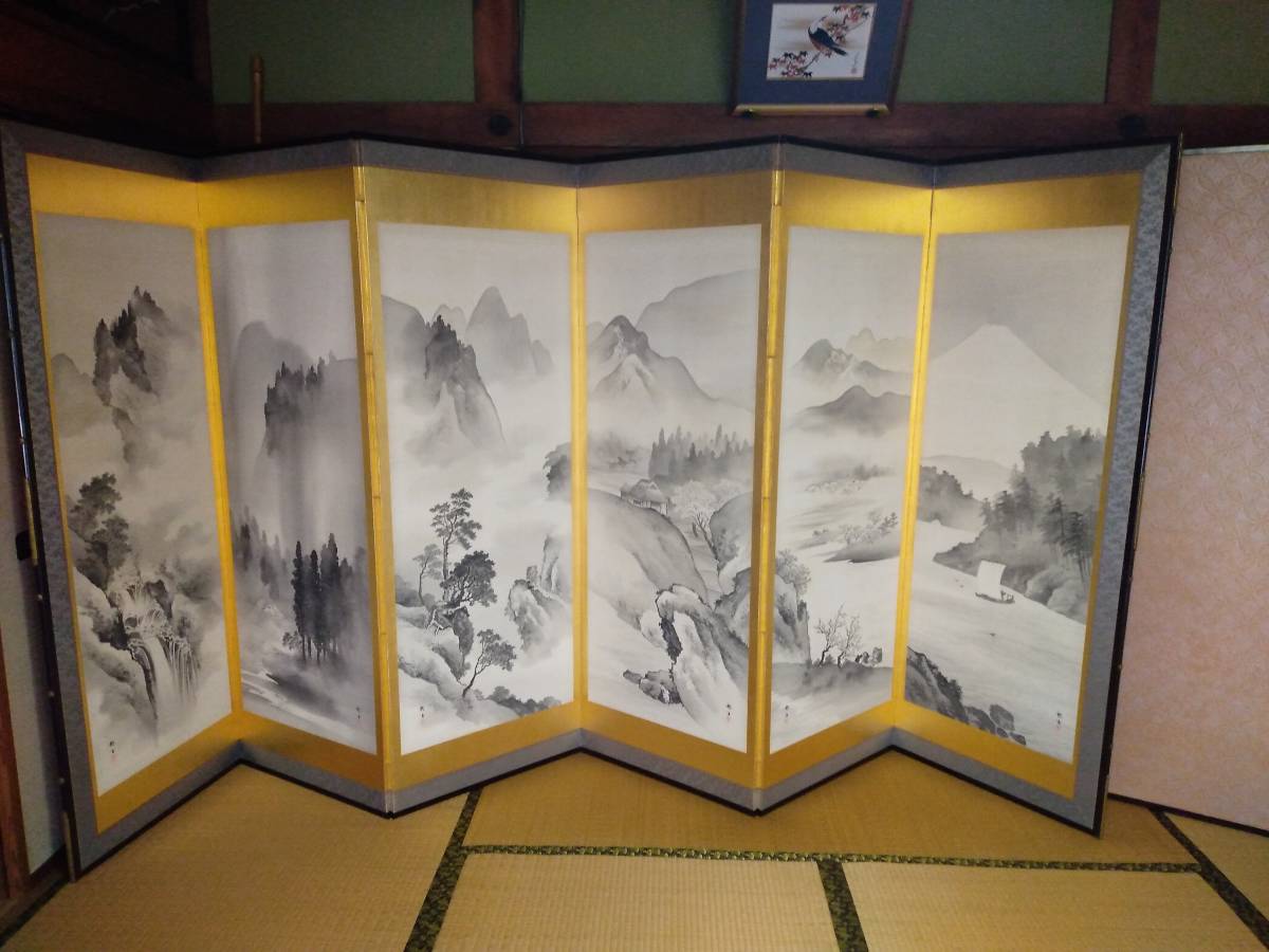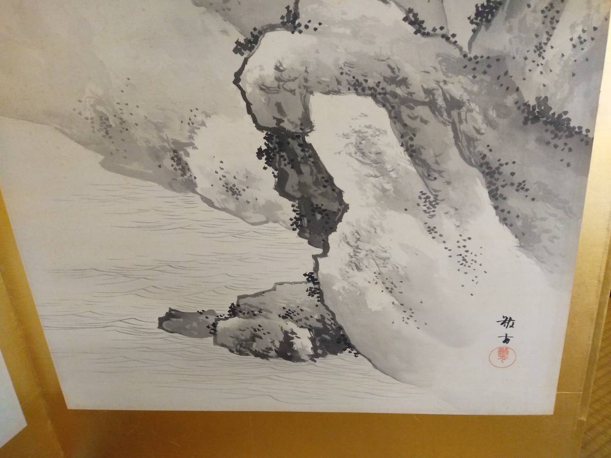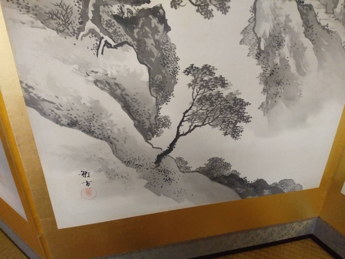引取限定 六曲半双 屏風 紙本 肉筆 竹田敬方筆(東京) 山水 ①です。こちらは引取限定です。古い物になりますのでシミ、表層のすれ傷等ございます。1枚あたりの絵の大きさは約50.8センチ約136.5センチ、畳んだ状態で、約63センチ約174センチです。素人採寸ですので、多少の誤差はお許し下さい。