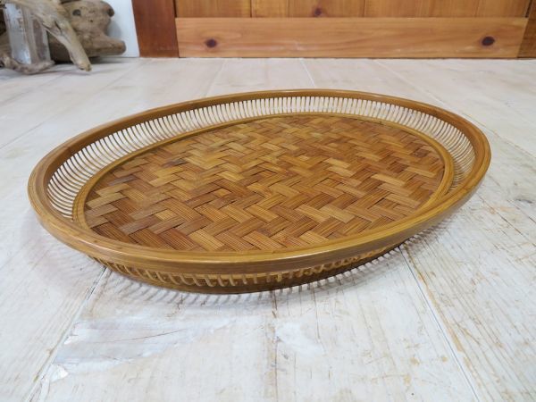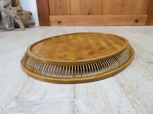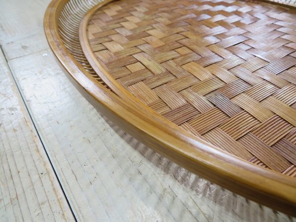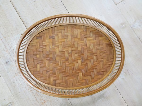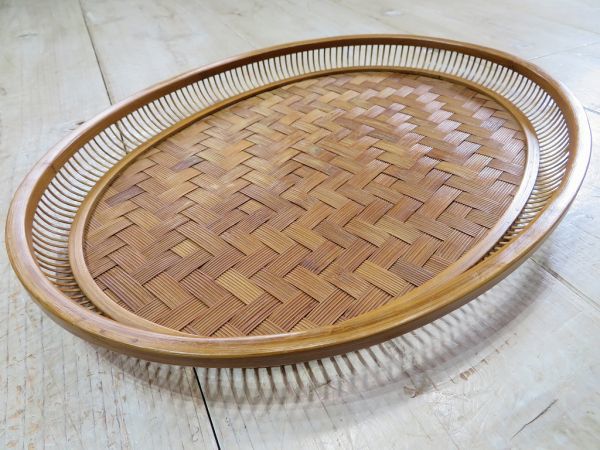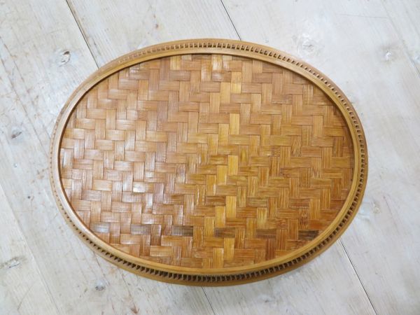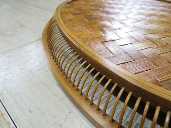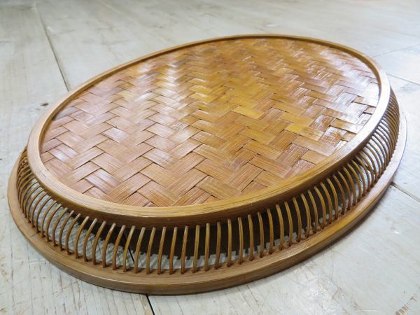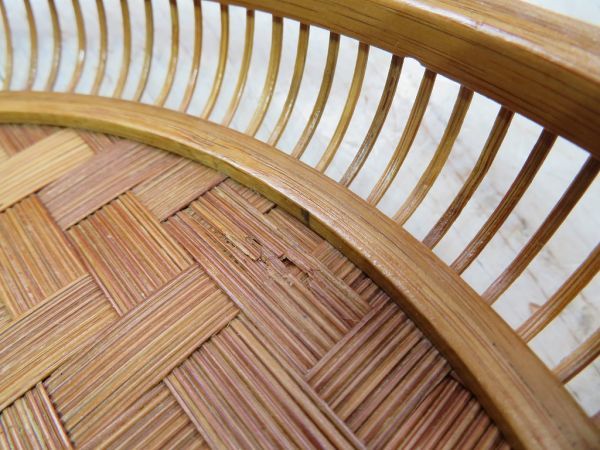 USED品です。前述の商品説明通り、出品前にメンテナンスをしました。使用頻度が低かったようで、経年による竹素材の色変わりと、10枚目の写真の細かな細工の欠けはありますが、そのほかのヶ所に気になるような大きな傷、割れ、掛け、ヒビはありません。とてもしっかりと作り込まれた竹細工のお盆です。永く、使いいただけるかと思います。