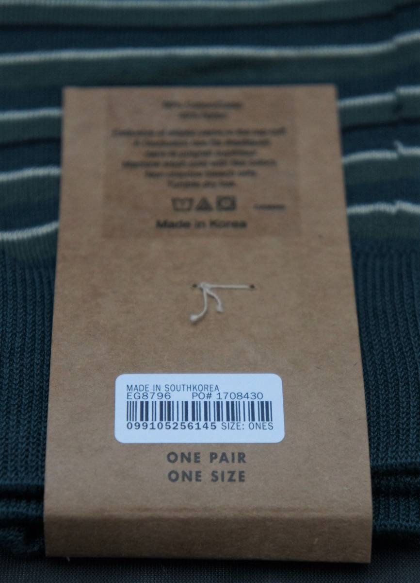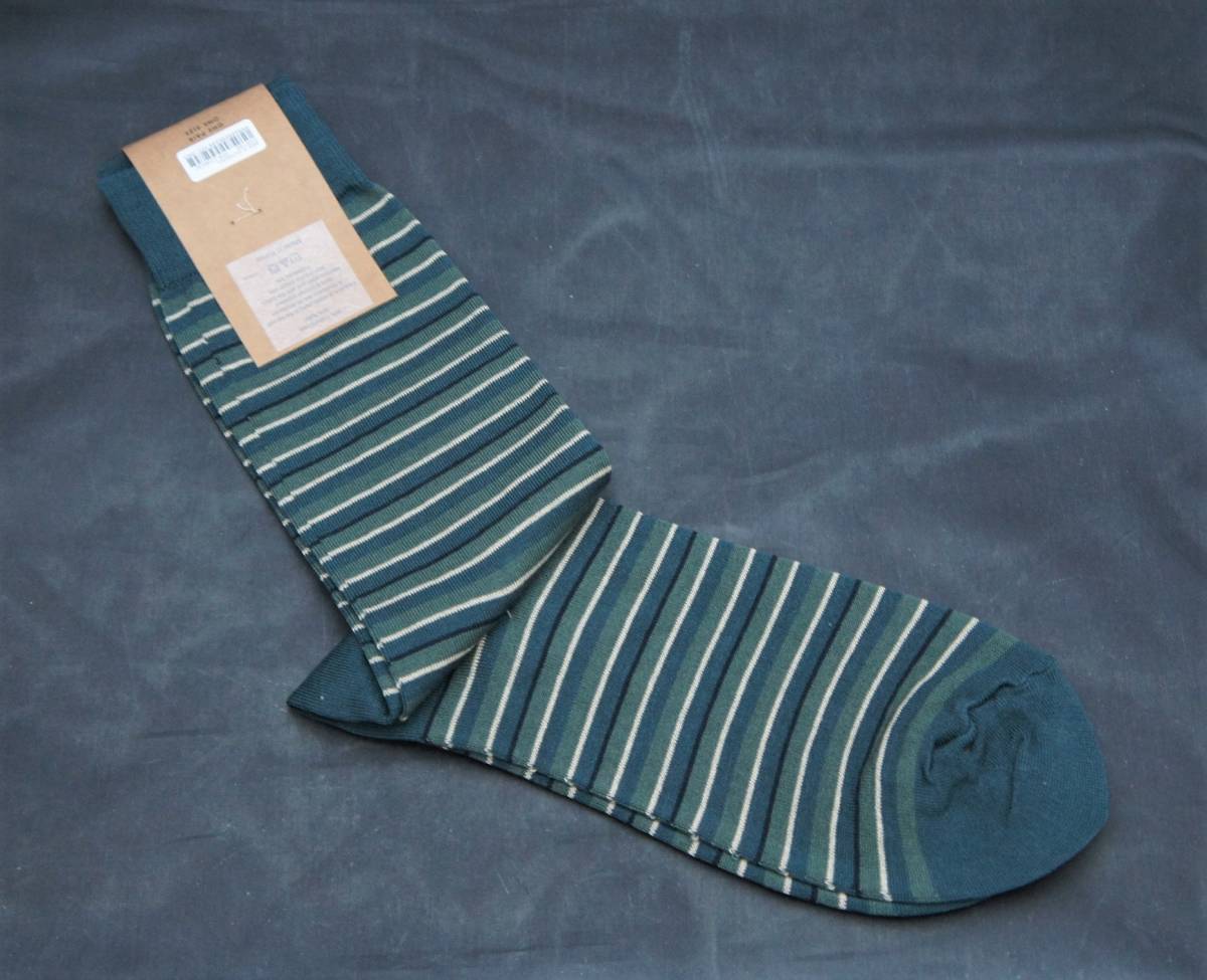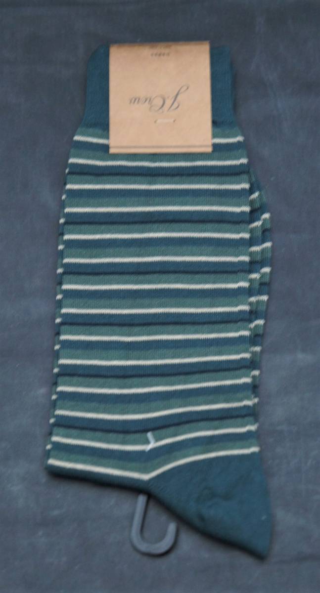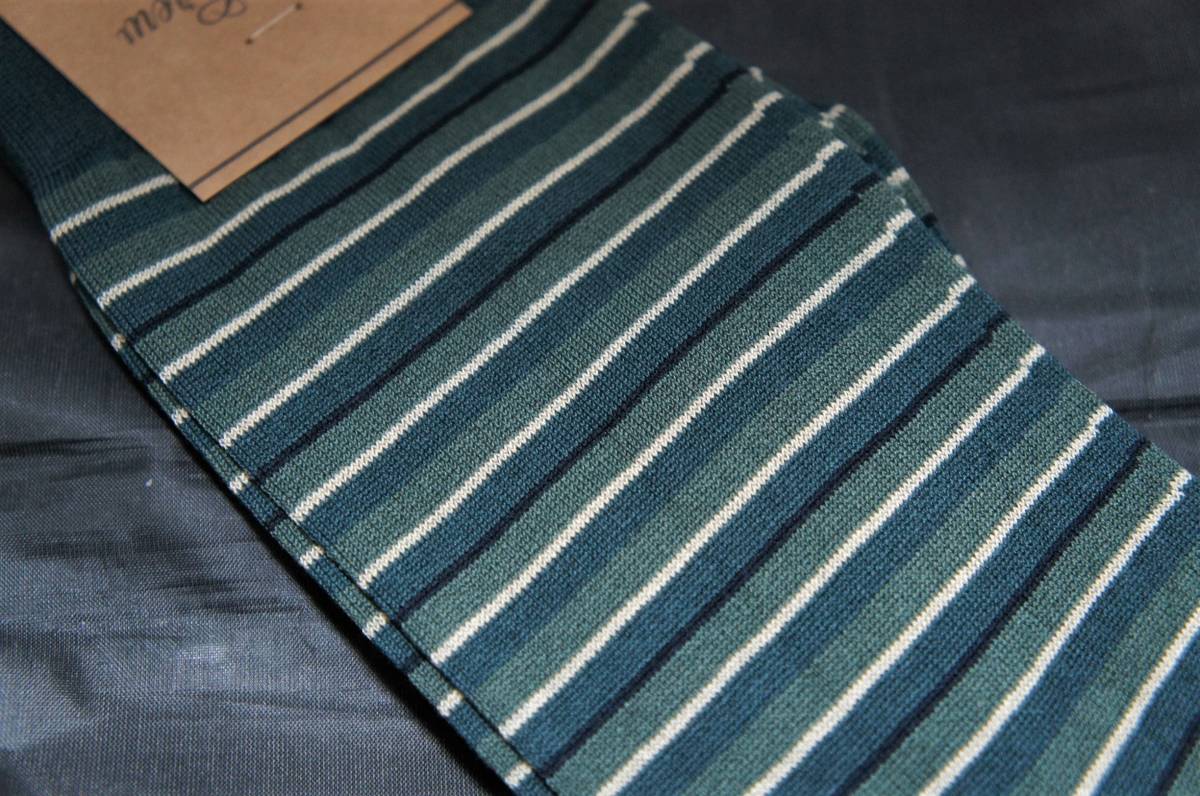 ダークモスカラーをベースにネイビー、ベージュ、ライトモスカラーのストライプが入ったソックスです。