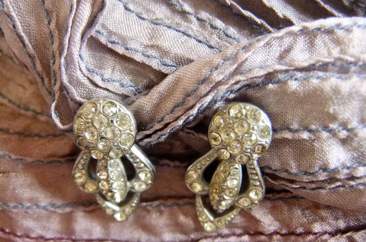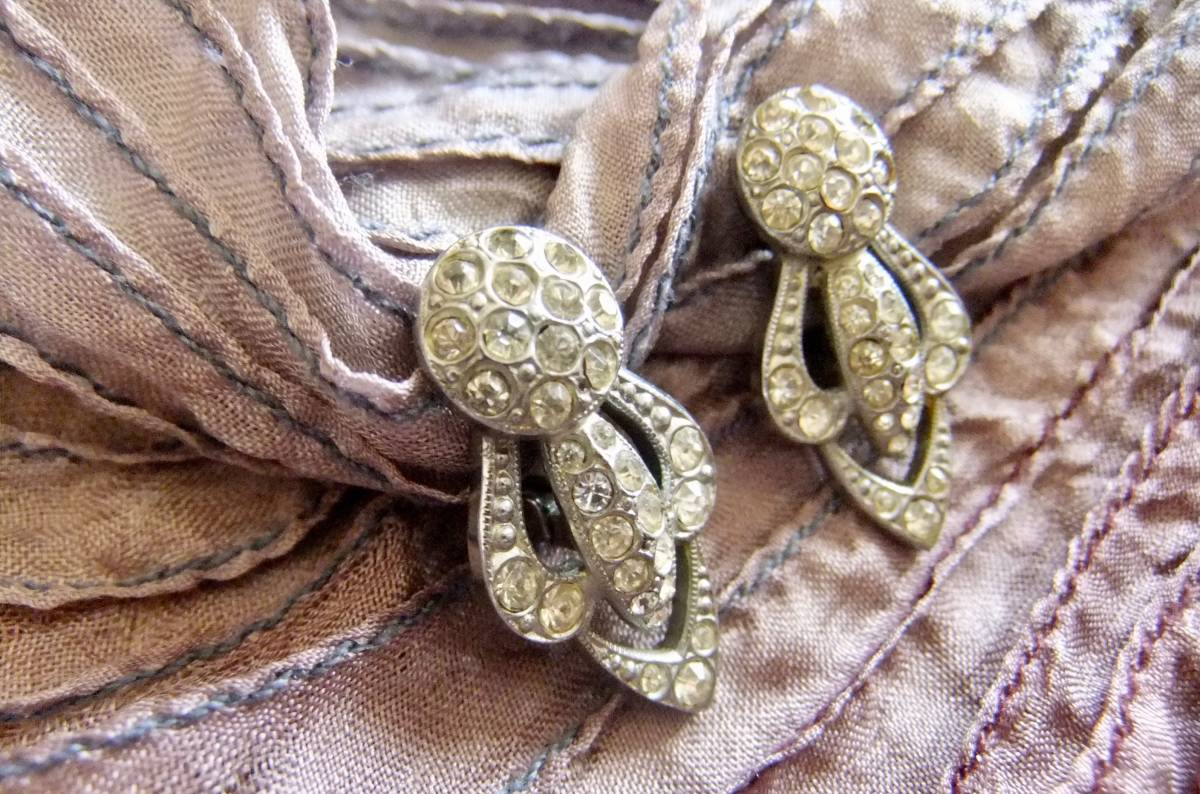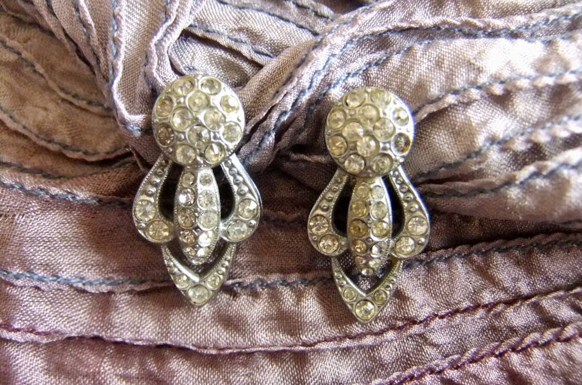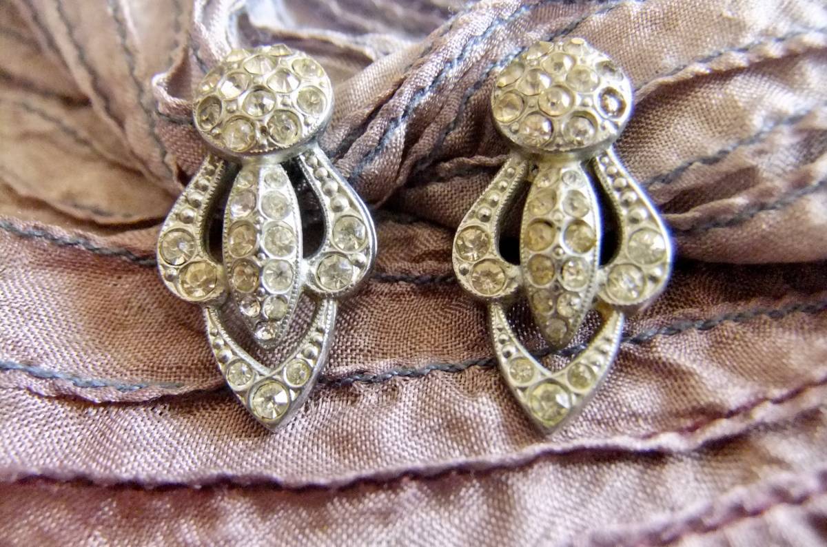ヴィンテージ品、クリアカラーストーン、アール・デコ調イヤリング。