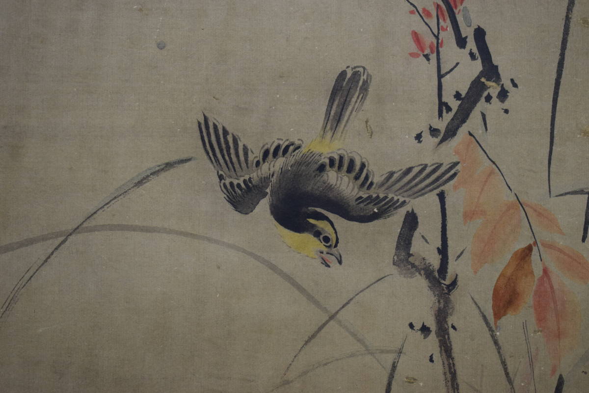 【真作】//狩野周信/紅葉花鳥図/桐題箱二重箱付/