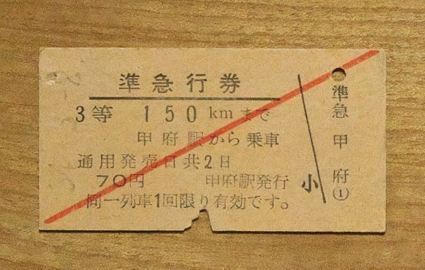 硬券 205 準急行券 甲府から150kmまで 3等70円 昭和34年 NO.1236