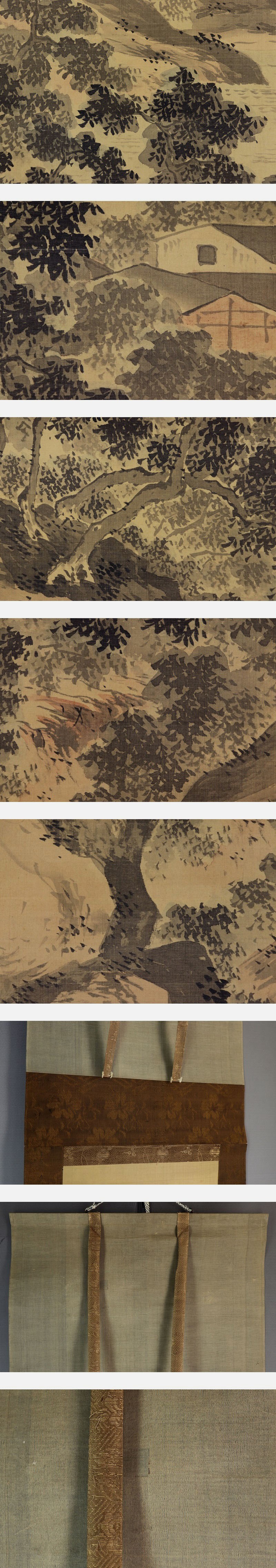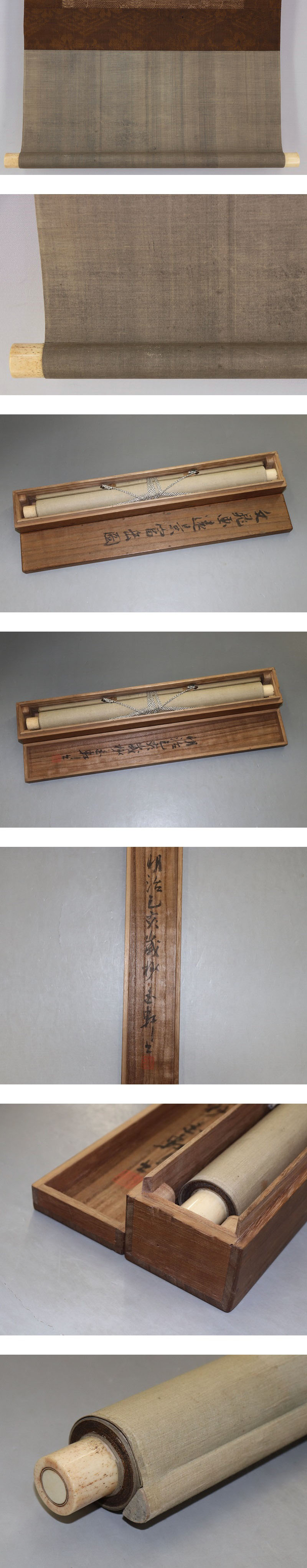谷文晁 たに-ぶんちょう (1763-1841) 江戸時代後期の画家。 宝暦13年9月9日生まれ。谷麓谷の長男。加藤文麗,渡辺玄対らに師事。 狩野派,土佐派,南宗画,北宗画,西洋画などの手法をとりいれて独自の画風を創出, 江戸文人画壇の重鎮となる。田安徳川家につかえ,松平定信編「集古十種」の挿絵もかく。 渡辺崋山ら門人多数。天保11年12月14日死去。78歳。江戸出身。 通称は文五郎。別号に写山楼,画学斎など。 本紙は、染み、軽い皺、ヤケがあります。 表装は、染み、汚れ、軽い折れ、皺、擦れ、虫食い、修復痕、軸先と箱に傷みがあります。 【サイズ】 作品 横約28.5cm×縦約82cm 表装 横約40.5cm×縦約161cm |
