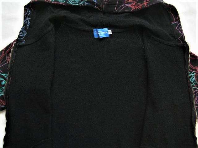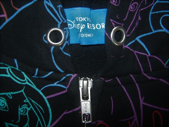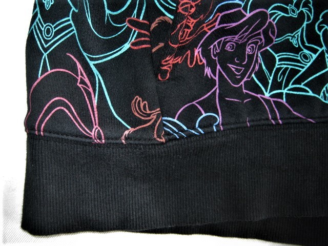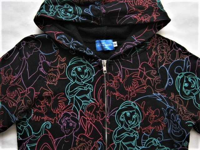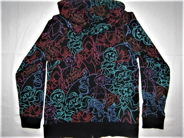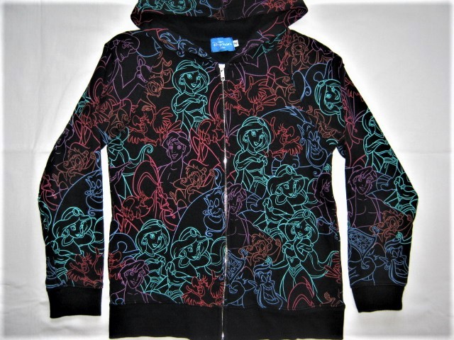★黒い生地にカラフルな線でアラジン、ジャスミン、アブー、ジーニー、イアーゴ、魔法の絨毯たちがデザインされたパーカー。