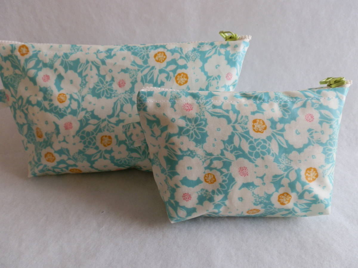 爽やかなミントグリーンの地に小花模様のラミネート生地のポーチ2点セット 軽く汚れにも強いので便利に使えると思います。サイズ;大:縦:約11cm 横:約22cm マチ:約4cm 小:縦:約9cm 横:約16cm マチ:約4cm・・・どちらも少し横長です。お揃いの黄緑色のスライダーがワンポイントです。◎趣味で家庭用ミシンを使用し作成しました。至らない部分も多々あるかと思います細かいことが気になる方はご入札をご遠慮願います。手作りにご理解のある方の落札をお願いします。何かわからない点がありましたら遠慮なくご質問してください。簡易包装で発送します。どうぞよろしくお願いいたします。