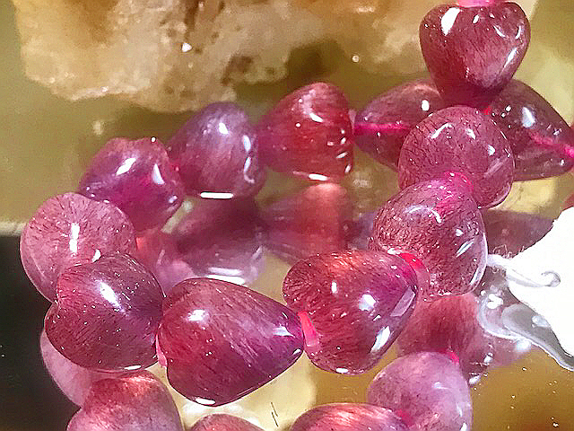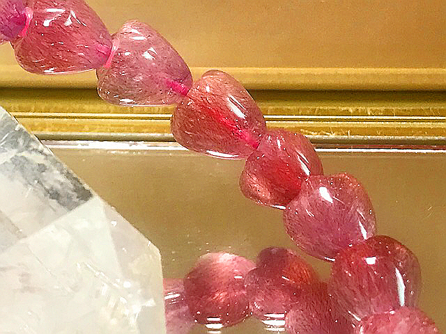 赤色の鱗鉄鉱と赤色の針鉄鉱が混入したものをストロベリークォーツと呼び、宝飾品やアクセサリーとして用いられています。
