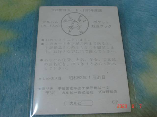 *1976年に、カルビー製菓から発売されました、プロ野球スナックのホームラン・カードです。