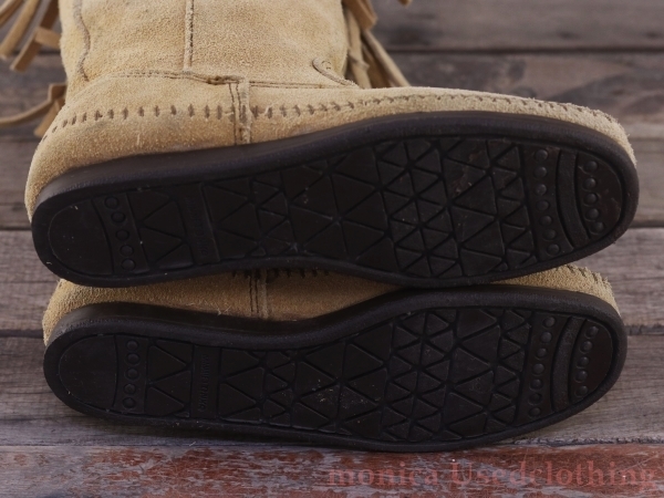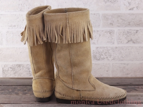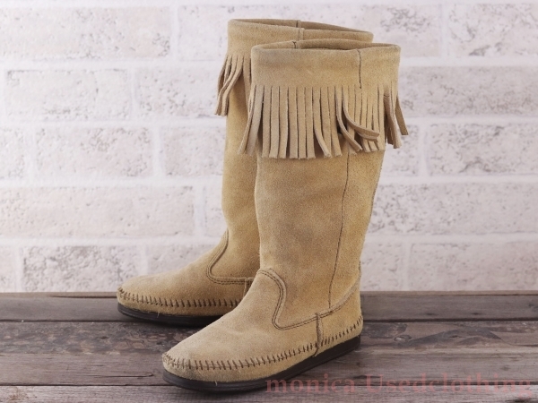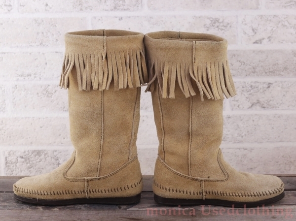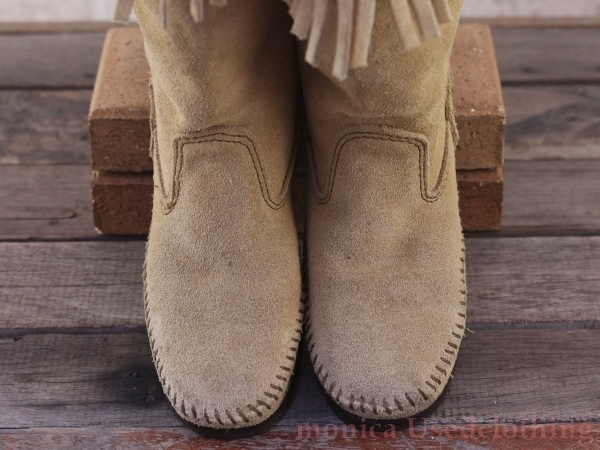 MG004◆レディース【ミネトンカ MINNETONKA】モカシンブーツ ミドル丈 フリンジ フォークロア ベージュ 6 23.5cm