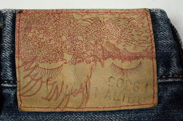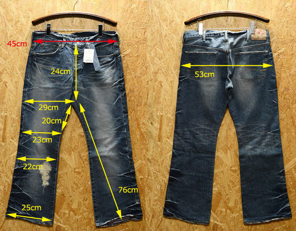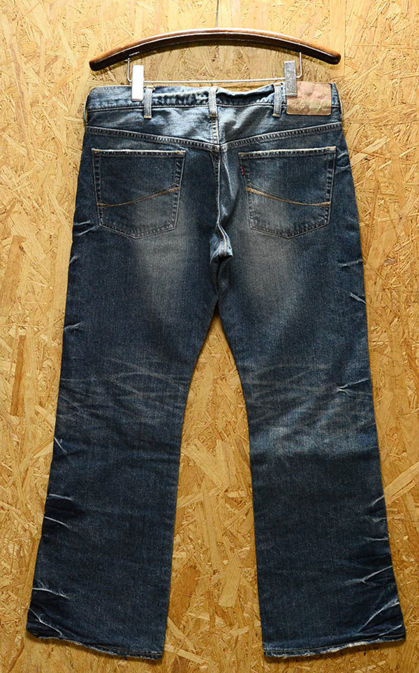 この製品は洗い加工、製品染め、シェービング(やすりかけ)、ブリーチ(脱色)、燃やす、生地組織を崩すなどの2次加工などをして、着古し感を出しています。製品の特性上、一枚一枚加工していますので
