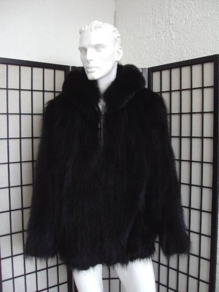 • スタイリッシュなブラック・ラクーン毛皮ジャケット。フード縁まわりにブラックフォックスのトリミング。フロントファスナー。暖かく、柔らかでスムースな手触りです。