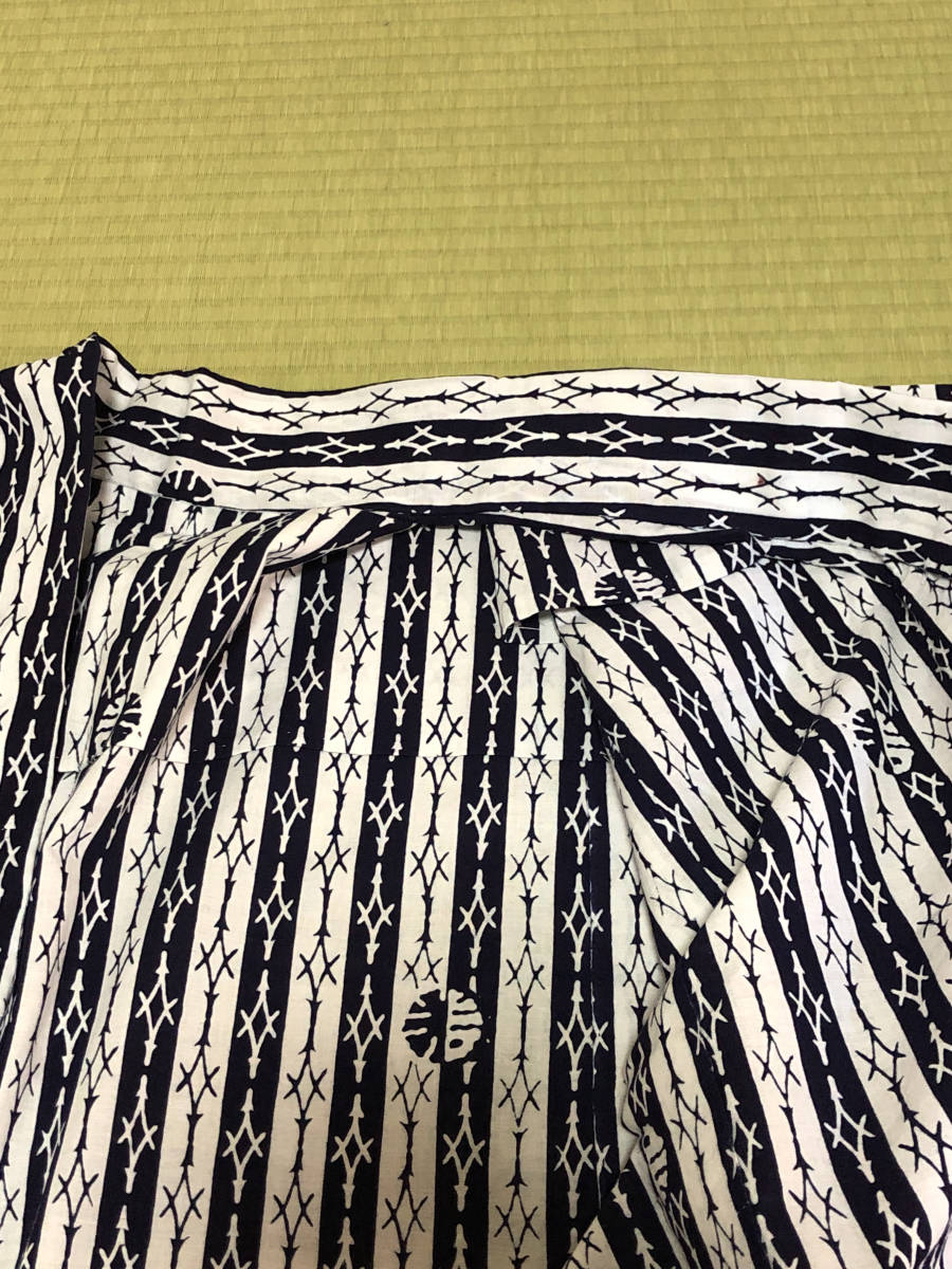 松葉菱の地白(地が白いもの)と地抜き(地が紺のもの)が縦模様になった粋な浴衣です。状態は未使用、個人保管品。大人の本染浴衣です。見落とし、微細なシミ汚れなどご理解の上、よろしくお願いします。神経質な方のご入札はご遠慮ください。