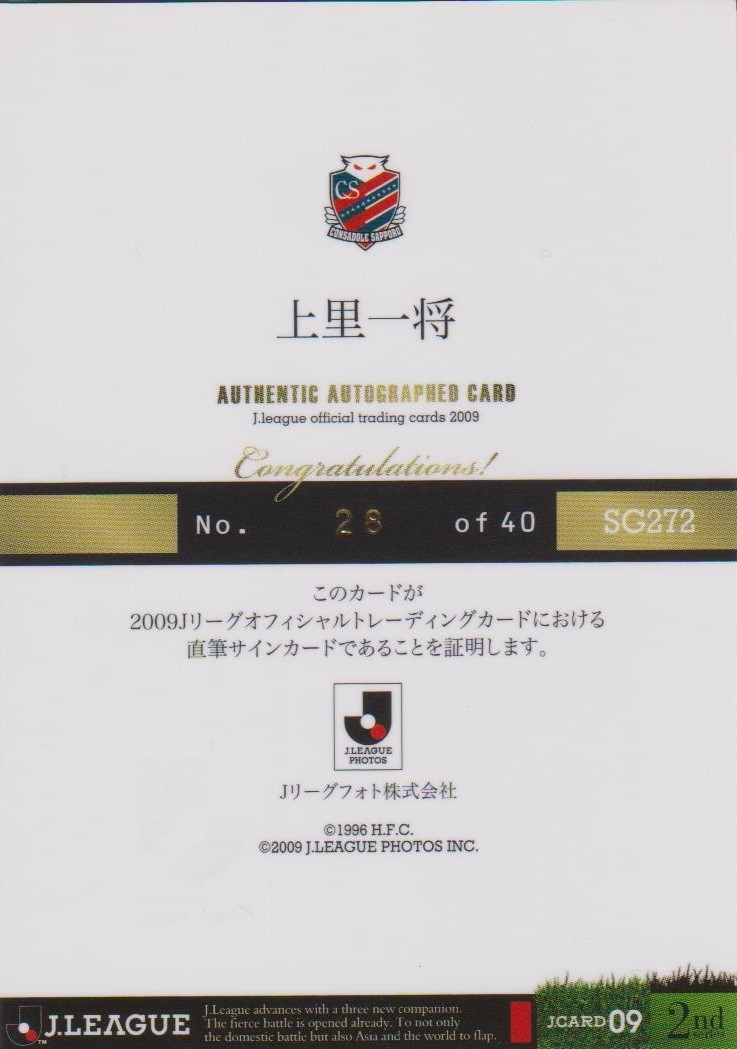Jカード 2009 2nd 上里一将 直書き 北海道コンサドーレ札幌 40枚限定 直筆サインカード ☆FC東京 徳島 熊本 琉球