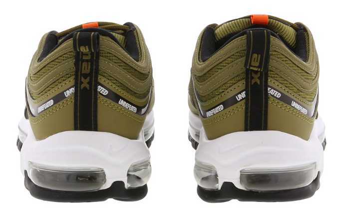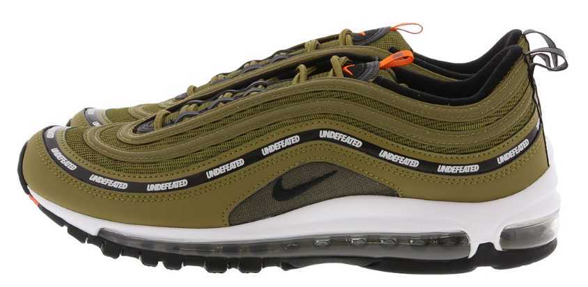 Nike Air Max 97 “Silver bullet”のモデルをリメイクした前作と同様、全体のおおよそを同色で施し、各所にアクセントの効いた差し色をチョイス。パテントマッドガードにはUNDEFEATEDのブランド名をあしらった1足となる。 全体をブラックで仕上げた1足はUNDEFEATEDのブランドバックボーンの一つでもあるミリタリーを表現したライトグリーンとオリーブを差し色としたカラーリング。 アッパーの特徴的なデザインである波のような流曲線のストライプはリフレクター使用となっている。 AIR MAX 97誕生時の近未来的スタイルは今も褪せることなく進化を続けている。