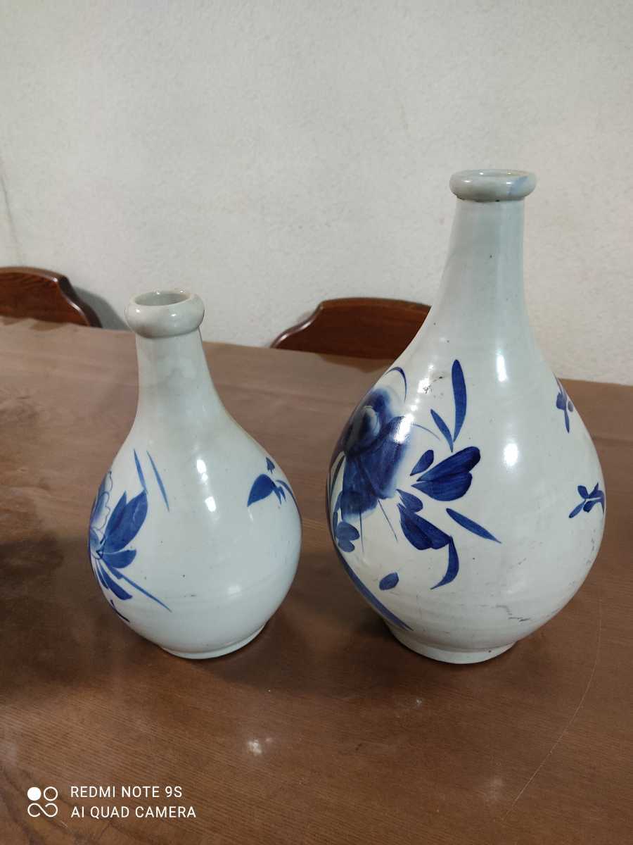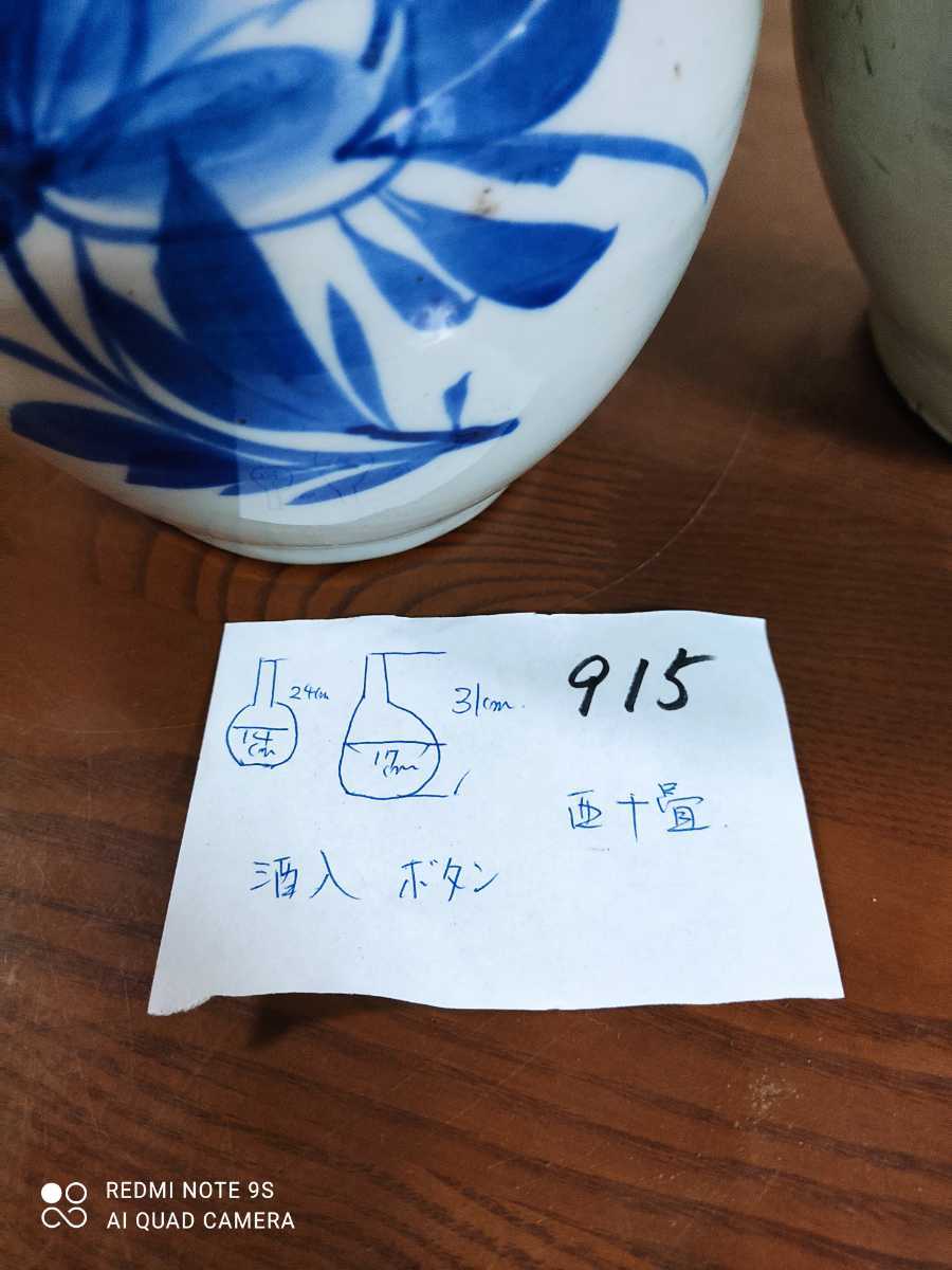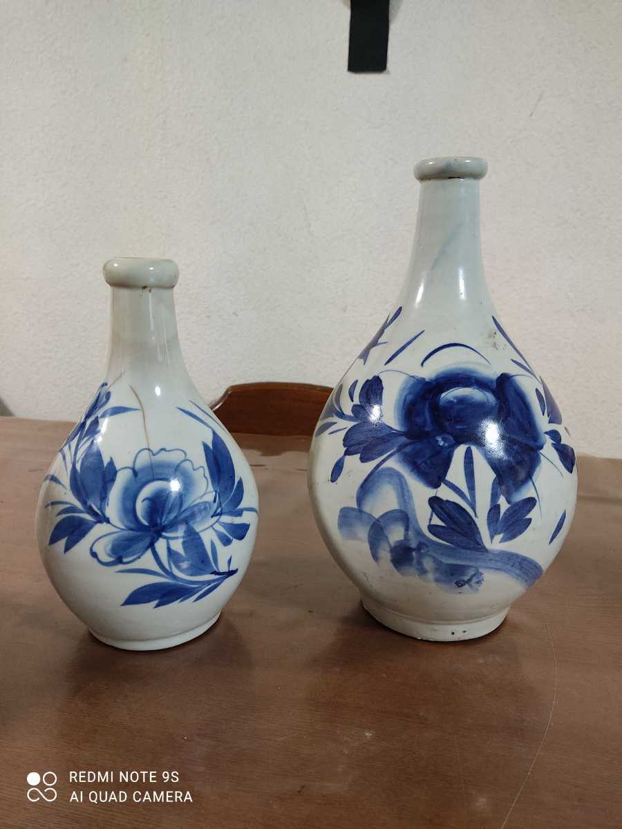 酒瓶 染付牡丹柄 陶器 昭和初期頃 size14cm×14cm×24cm・17cm×17cm×31cm №915