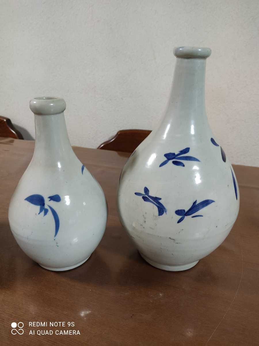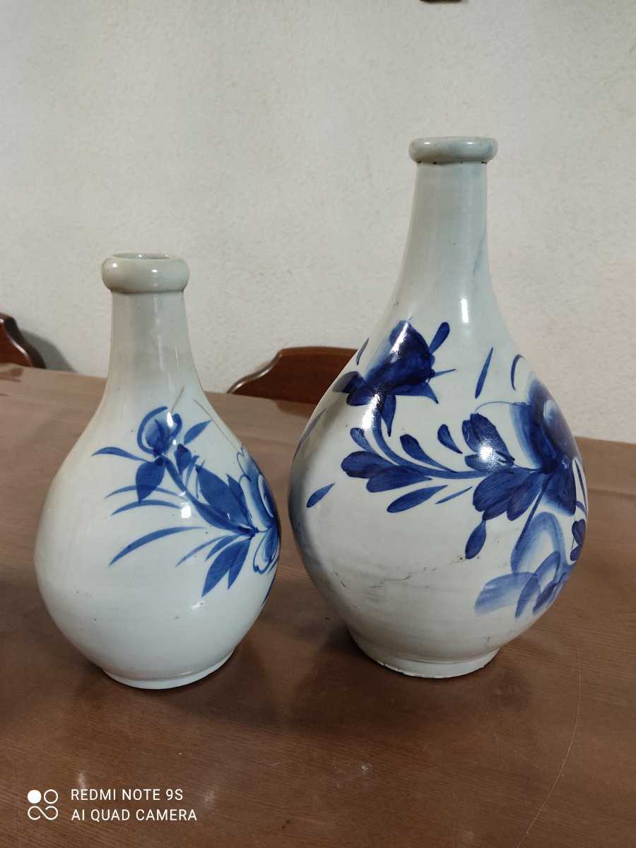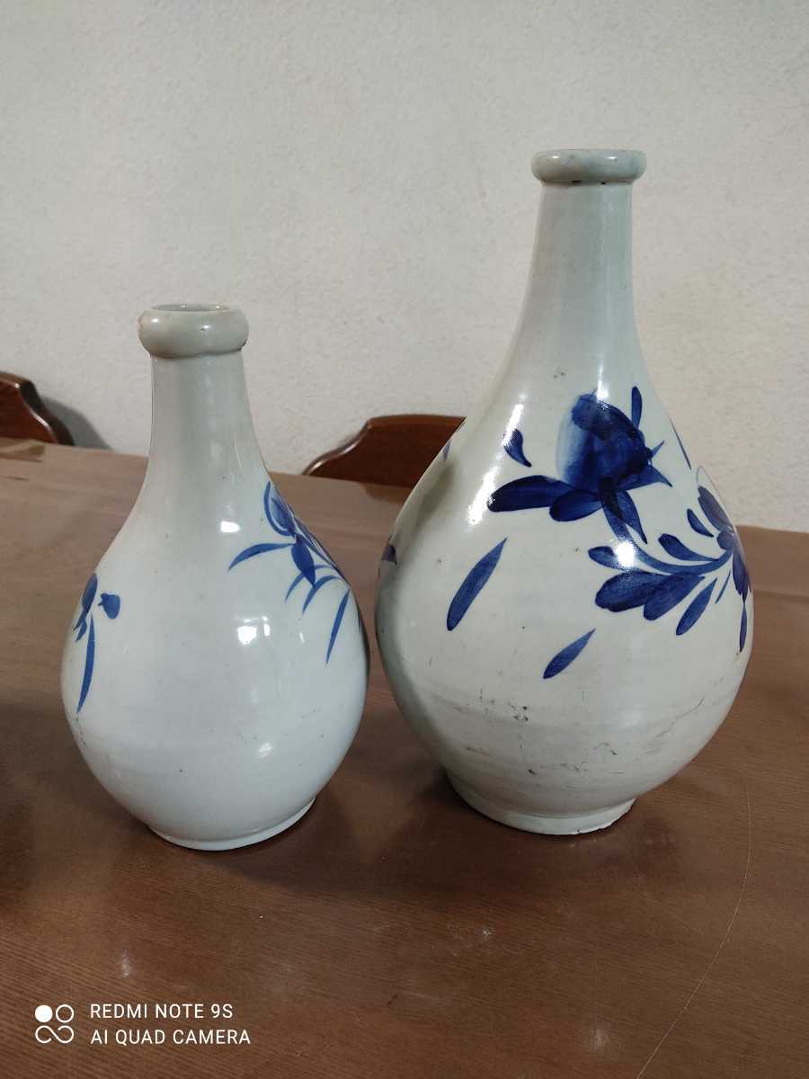 酒瓶 染付牡丹柄 陶器 昭和初期頃 size14cm×14cm×24cm・17cm×17cm×31cm №915