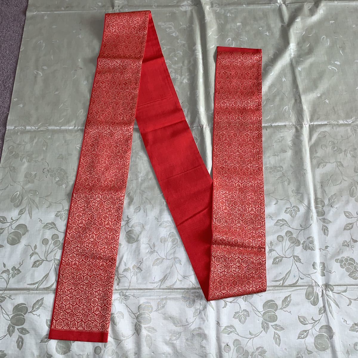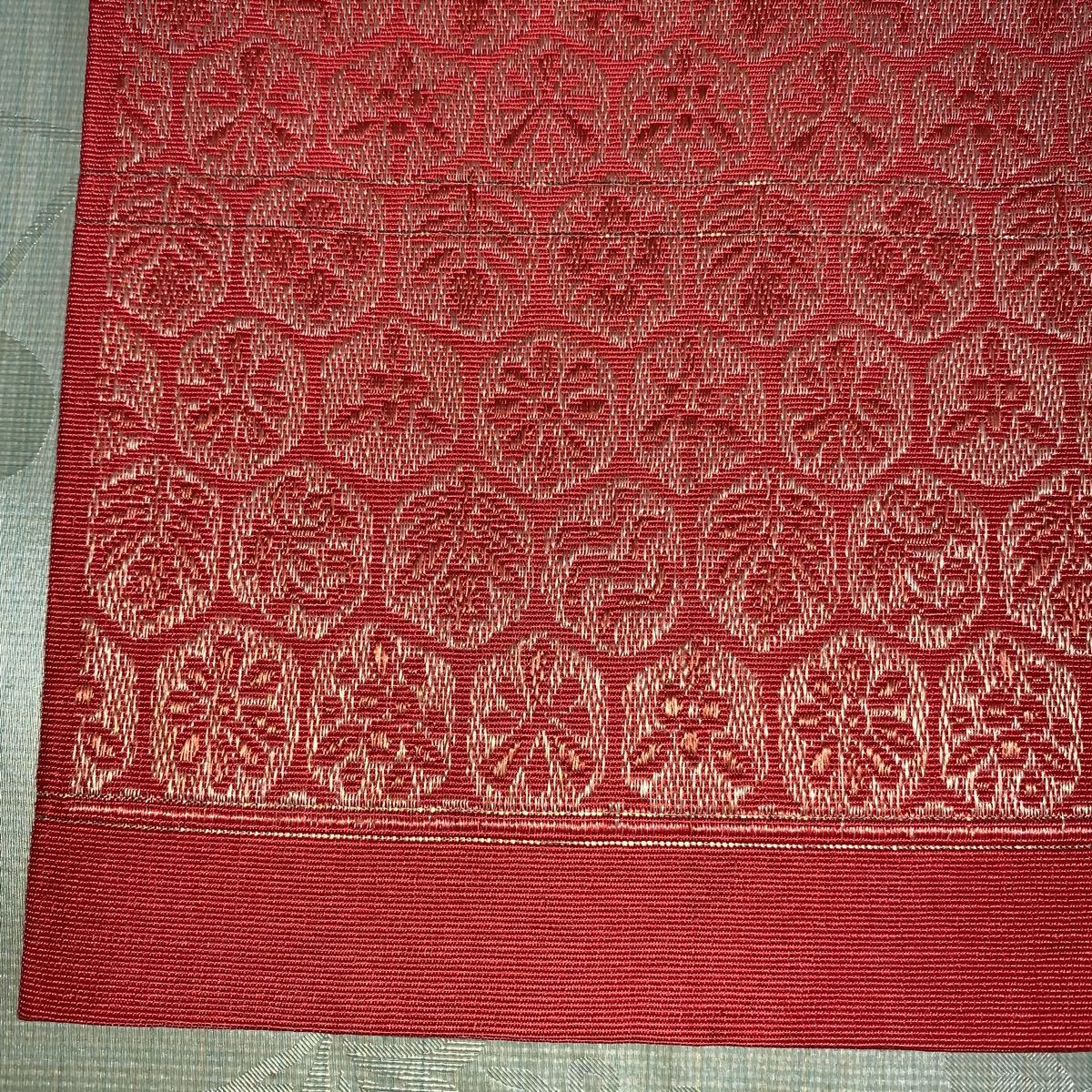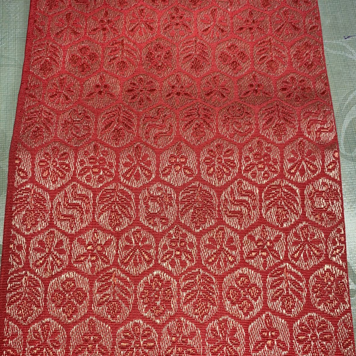 ■半幅帯 絹 赤ピンク地 六角柄 草花柄 白オレンジ色■