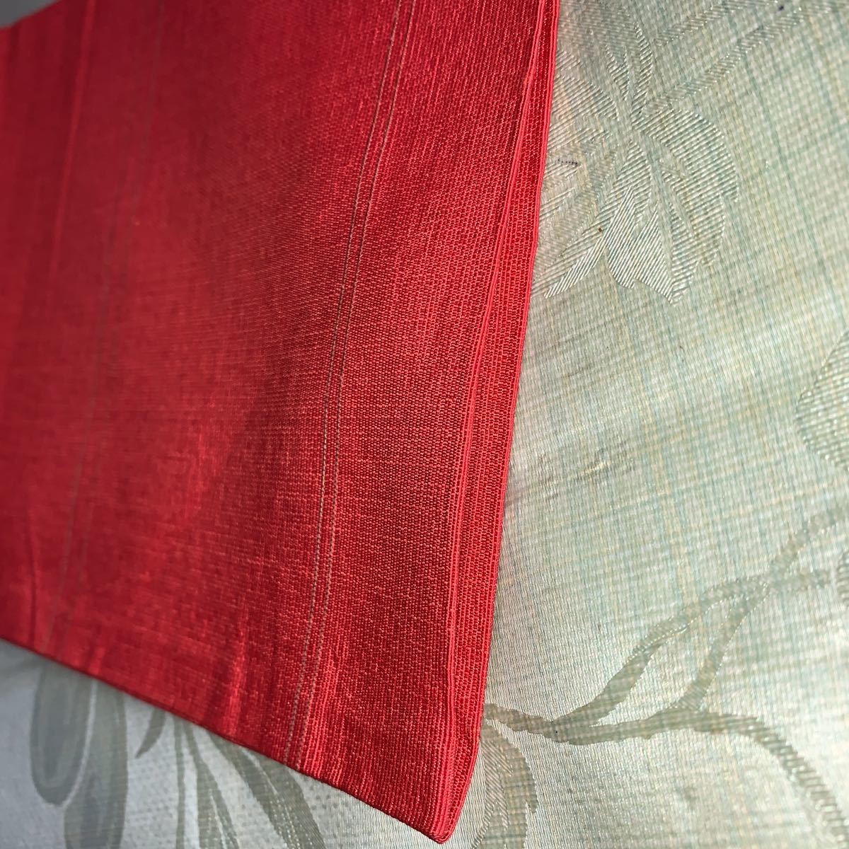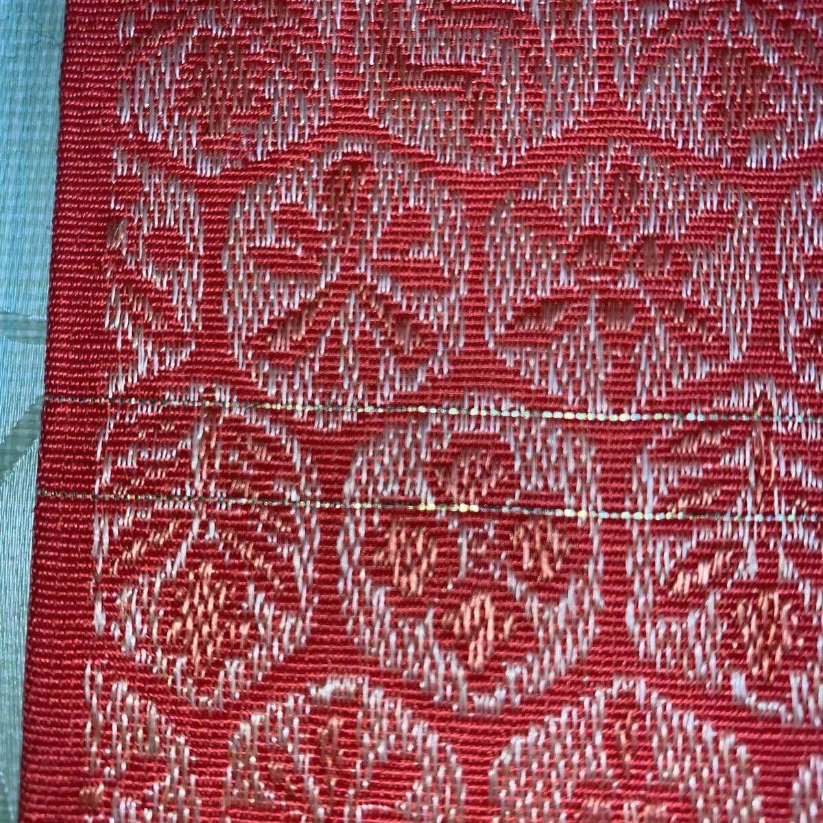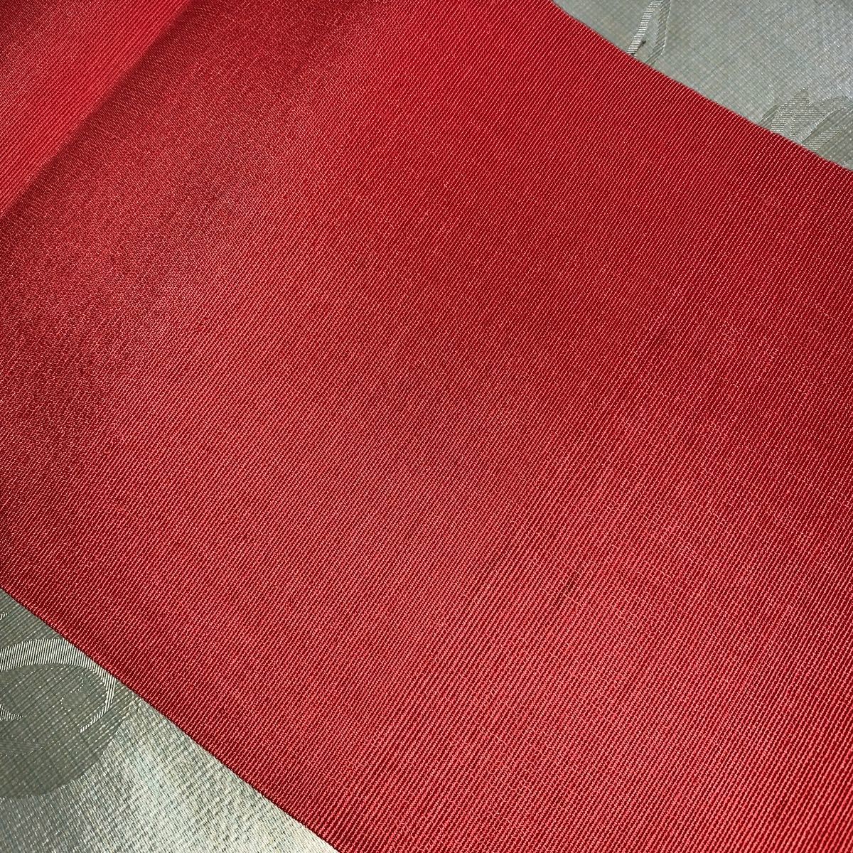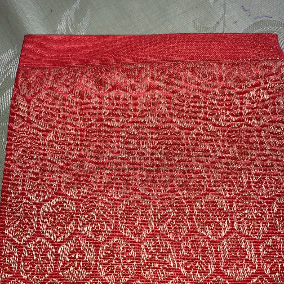 ■半幅帯 絹 赤ピンク地 六角柄 草花柄 白オレンジ色■