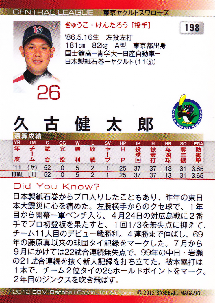2012BBMベースボールカード1st 198 久古健太郎 ヤクルト 東京都 国士舘高校 青学大