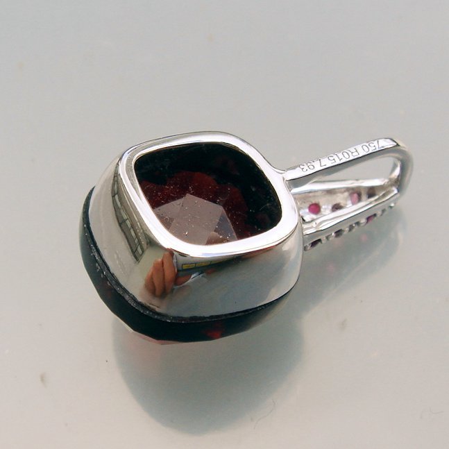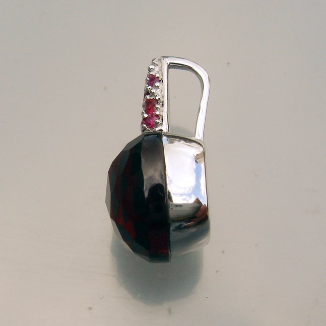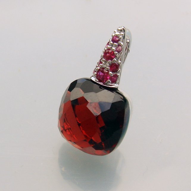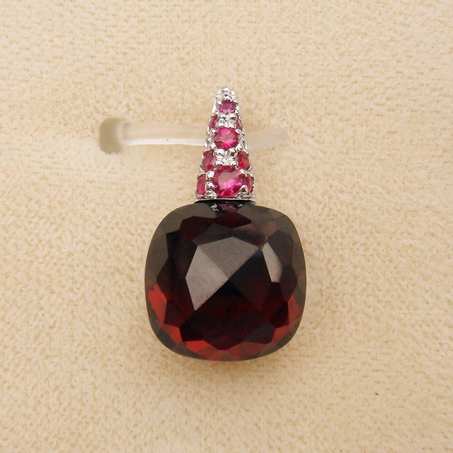 バチカンを兼ねた飾り部分には、同じ赤でも少し色味の違う綺麗なルビーが留まり、お互いの美しさをより引き立て合っています。