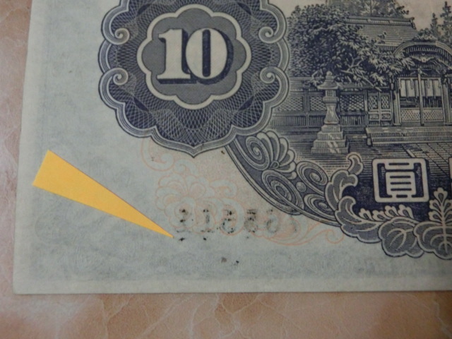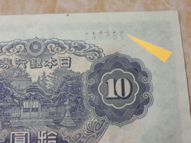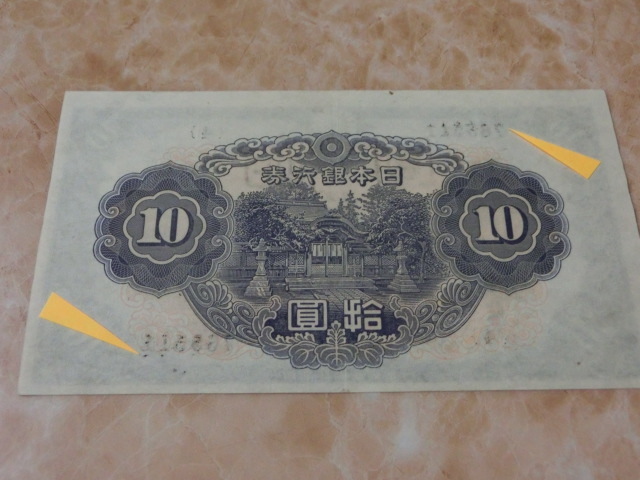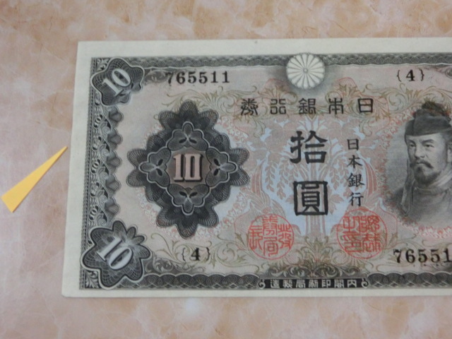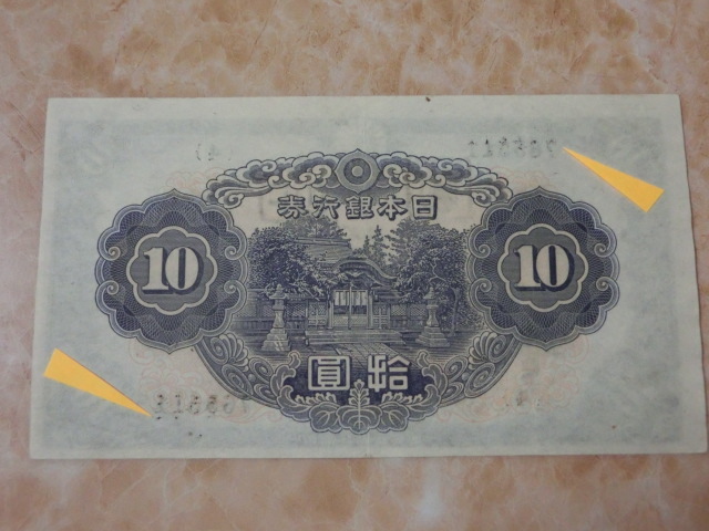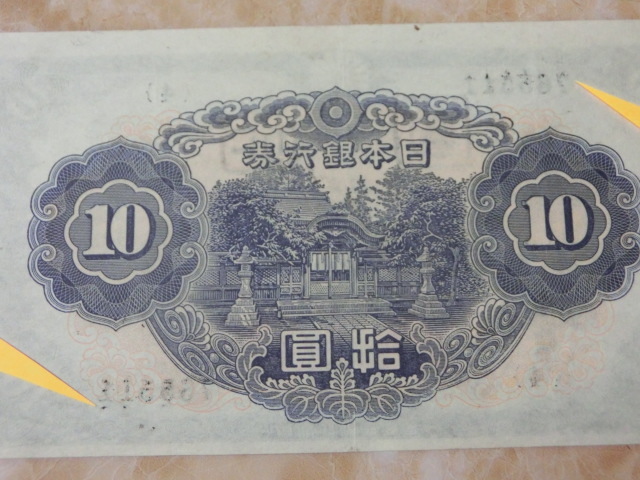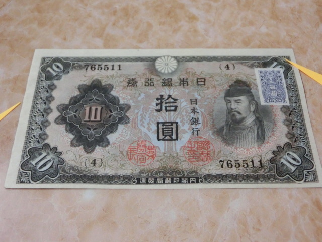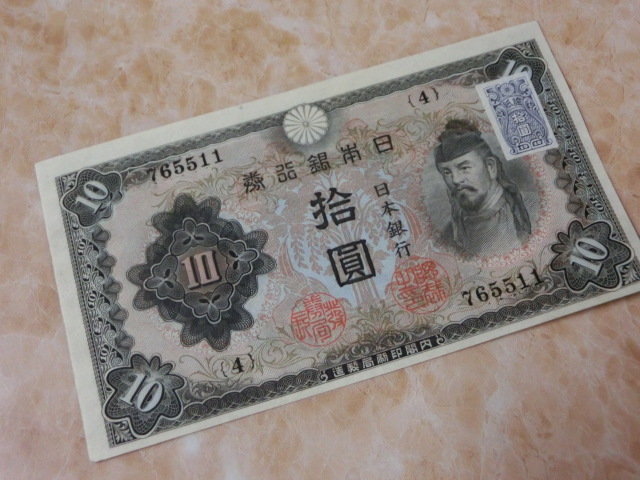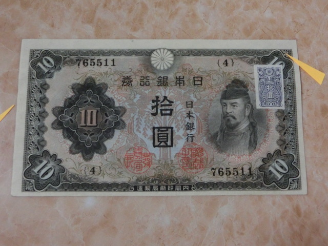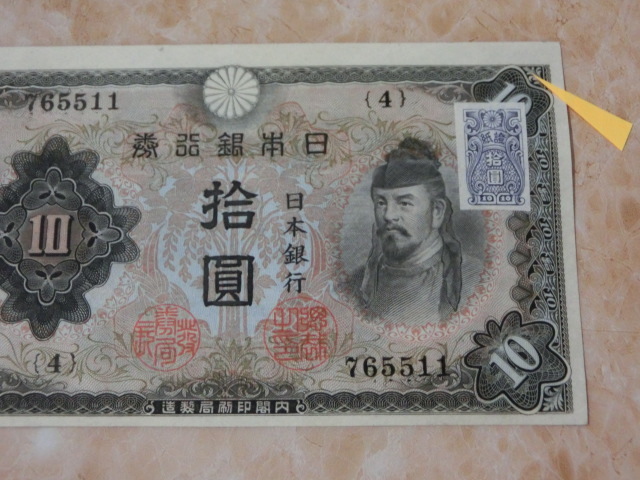 不換紙幣10円 2次10円の証紙付で裏に数字が出ています。