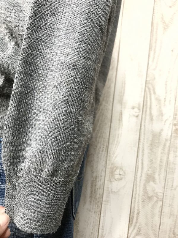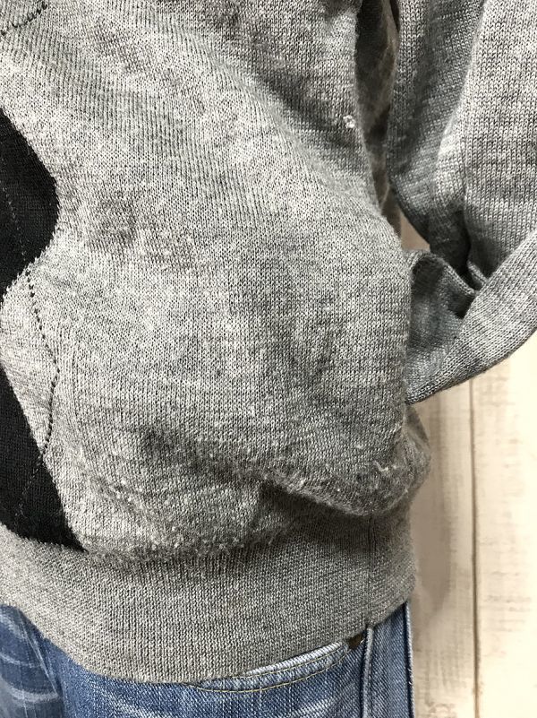 着用に伴う、シワ、薄汚れ、ホツレ、毛玉あり。虫喰い穴を数カ所見つけてしまいました。 画像8枚目、服本体から見て右下、下から2段目黒ダイヤの白くなっているところが穴です。3ミリぐらい。それと、右本体から見つて左、下から3段目のジッパー付近にも3ミリの穴が見つかりました。 縫い物が、できる人ならカケハギ・ワッペン貼りなどでリペアは出来ると思います。 タバコは吸いません。ペット飼育しておりません。